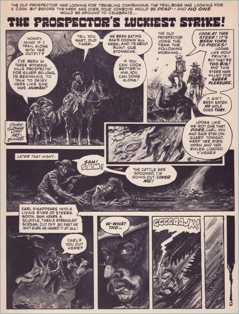 Here’s a rarely-seen Stephen R. Bissette gem, The Prospector’s Luckiest Strike! I wasn’t aware of its existence until recently, when I chanced to purchase an issue of Scholastic’s Bananas devoted entirely to comics. It turned out to hold a pair of Bissette aces, the other being A Toast to Mr. Dalyrimple!. I wondered why these dark lovelies had been left out of Eclipse’s 1985-86 Fearbook and Bedlam, collections of Scholastic material. Were they too recent?
