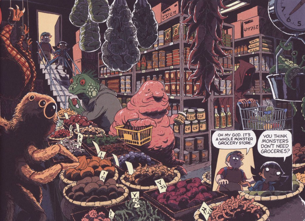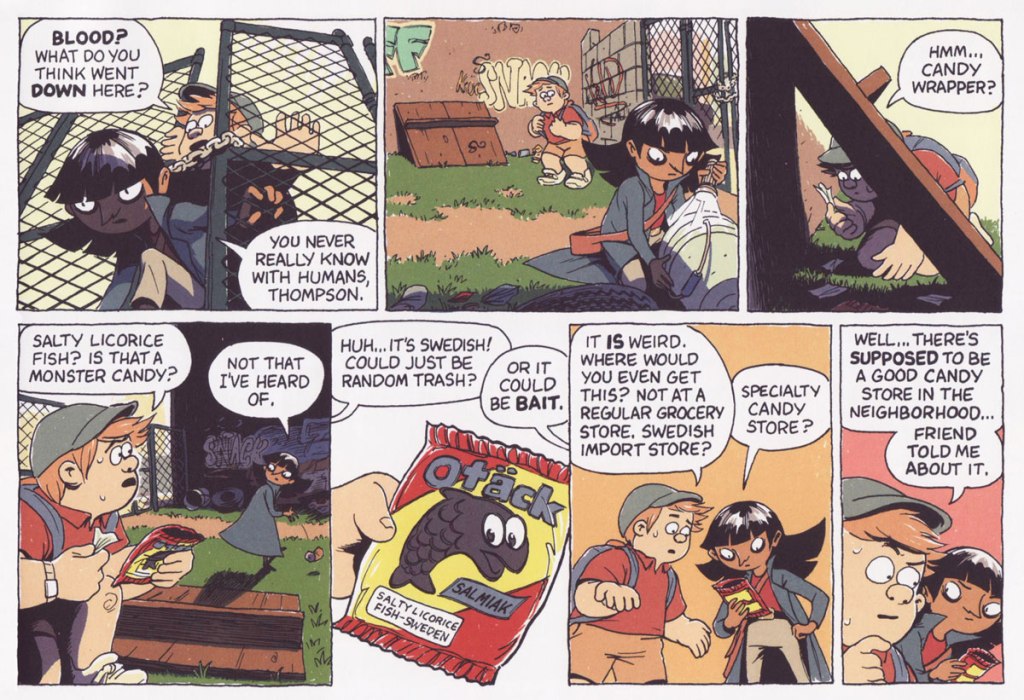 What’s an enterprising kid to do when he’s plucked out of his small home town and dropped into a big city? Worry about getting mugged, first of all, then dodge his hippy-ish parents’ attempts to make him eat big-city-weird-food (kimchi or paneer spinach? ew*)… but eventually get his bearings and go exploring. Our intrepid protagonist Charles fancies himself a reporter, so when he’s surprised by a monster at night (‘huge! fangs! hair!’), he heads out to investigate and eventually runs into Margo Maloo, ‘monster mediator’. Surely she needs a sidekick… or does she?