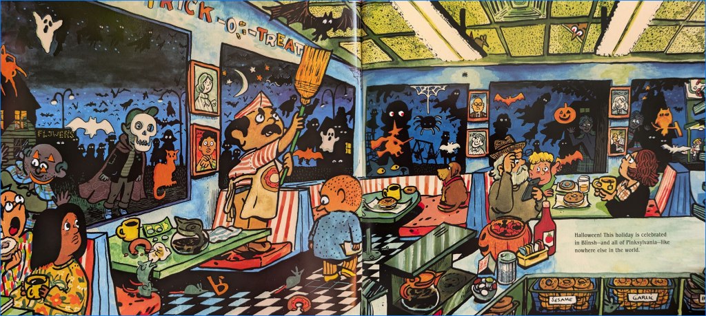 This book was illustrated by Aaron Renier, whom I already knew from his young readers series The Unsinkable Walker Bean. The latter definitely has its heart in the right place, but failed to fully capture my interest, though I can confirm the art was great, so I was happy to see Renier’s drawing talent matched up with a story I could really sink my fangs* into. Not that Vampires of Blinsh has a story, per se – which seems to have baffled a few readers, some of whom, judging by their reviews, found it confusing and indecipherable. VoB is more of a quick dip into the non sequitur, somewhat absurd, always charming world of Pinksylvania, as readers are taken on a quick tour of Blinsh, its twin sister city Blorsh, as well as the capital of Pinksylvania, Farshningle. Many potential storylines are hinted at, but none are lingered upon, as Pinkwater effortlessly flings ideas (of which he clearly has an abundance) around and pirouettes on to the next vignette.