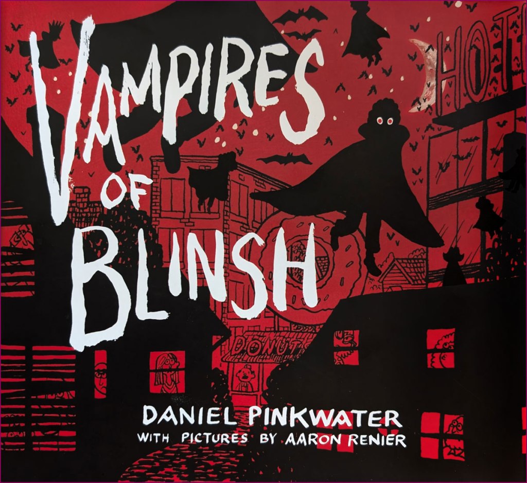 The pages of Vampires of Blinsh (Sept. 2020, Abrams Books for Young Readers) are positively overflowing with jolly vampires, promenading chickens, sneaky racoons, people tripping over bikes, floating basketball players, children munching doughnuts, janitors in eyepatches, and so on. In short, a typical Daniel Pinkwater creation, and I say this with the utmost delight.