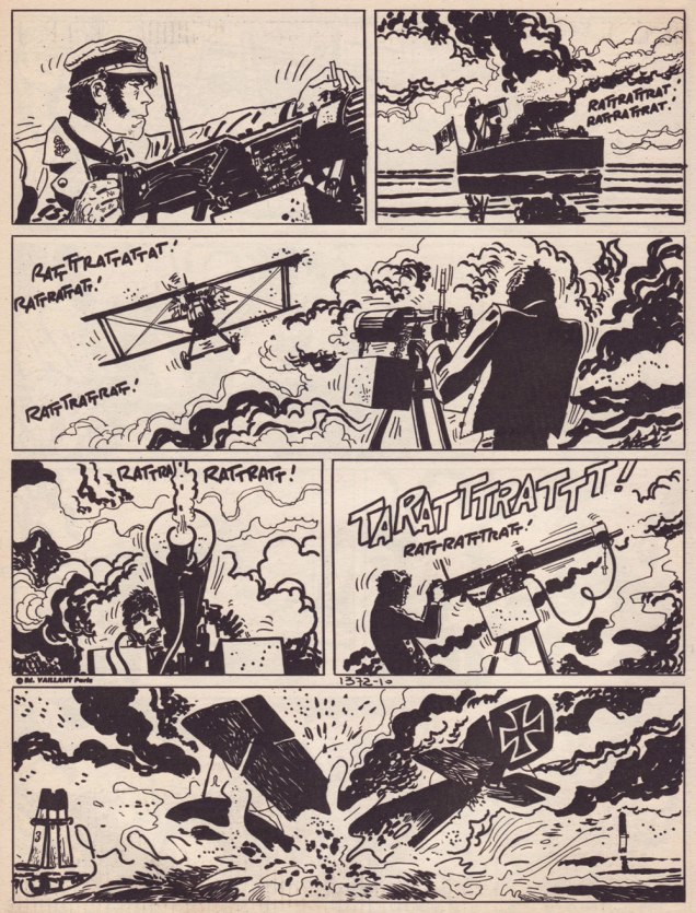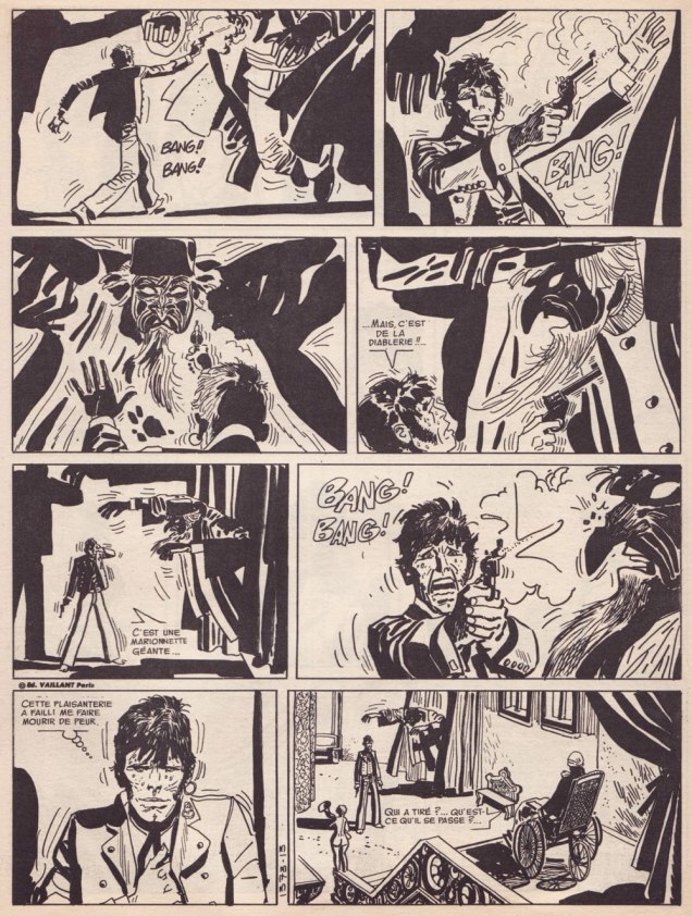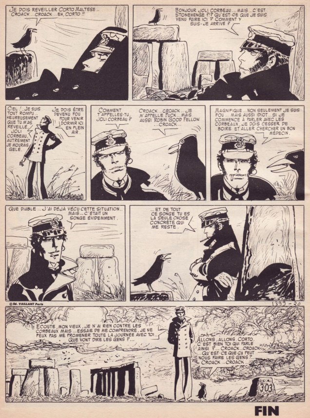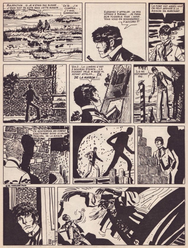 Maltese (named, indeed, after Dashiell Hammett’s famous novel… or rather its John Huston-helmed cinematic adaptation) created in 1967 for the Italian magazine Sgt. Kirk… saddled with a modest print run of 3000… and rather soon cancelled owing to low sales! There, Corto turned up — as a minor player — in a tale entitled Una Ballata del Mare Salato (“A Ballad of the Salt Sea”). Corto’s peregrinations then followed their tortuous course in French bédé weekly Pif Gadget from 1970-73, where the strip mostly baffled — or even enraged — readers but was tirelessly championed by the enlightened editorial team. In his Prix Goncourt-winning biography*, Hugo Pratt, trait pour trait, Thierry Thomas states: « With each new episode, the magazine received letters from readers who couldn’t make head nor tail of it, and demanded Rahan, nothing but Rahan. » Clearly, the world wasn’t ready for Corto… but that acceptance would gradually arrive, at least in the non English-speaking world**.