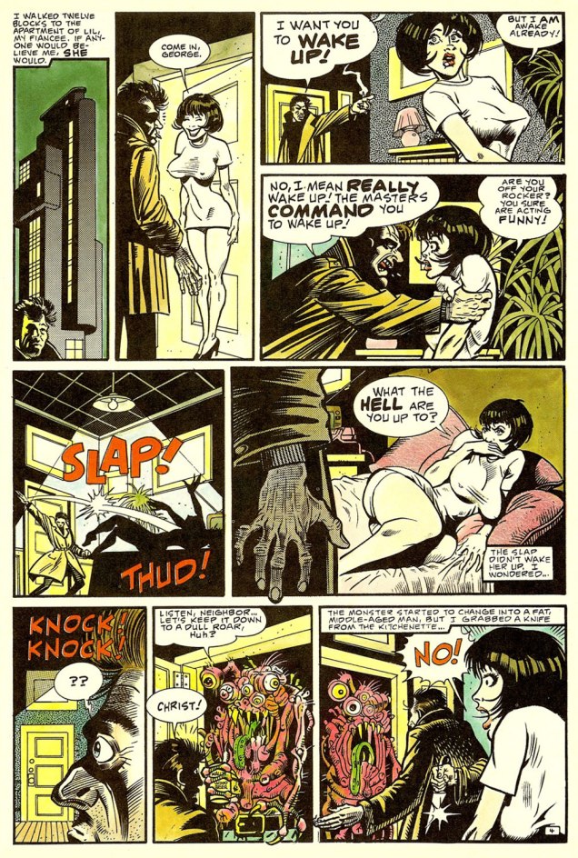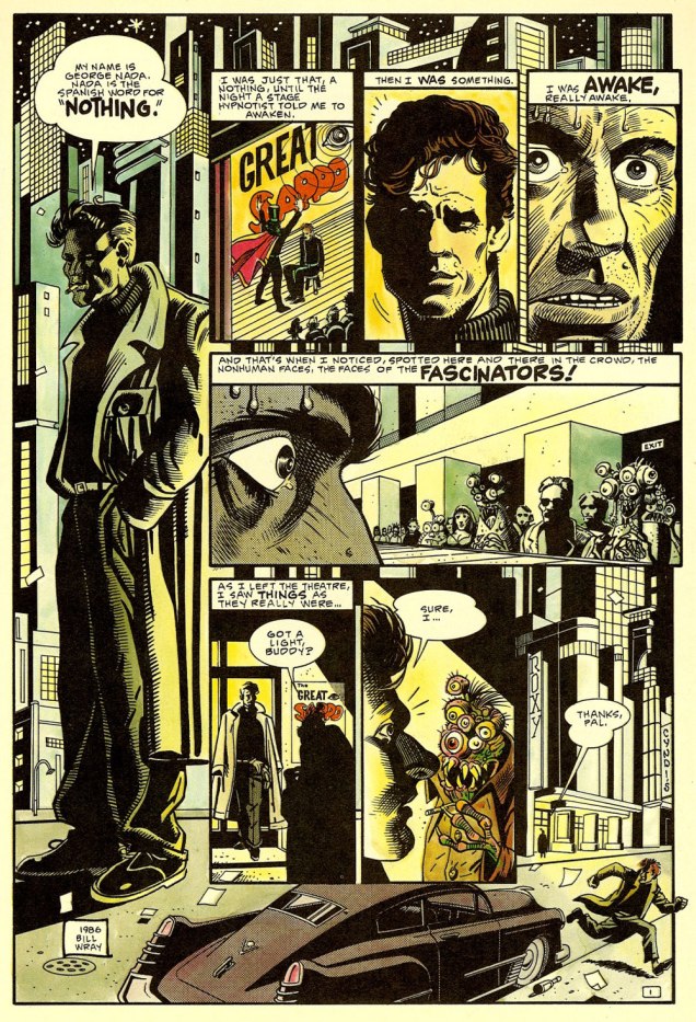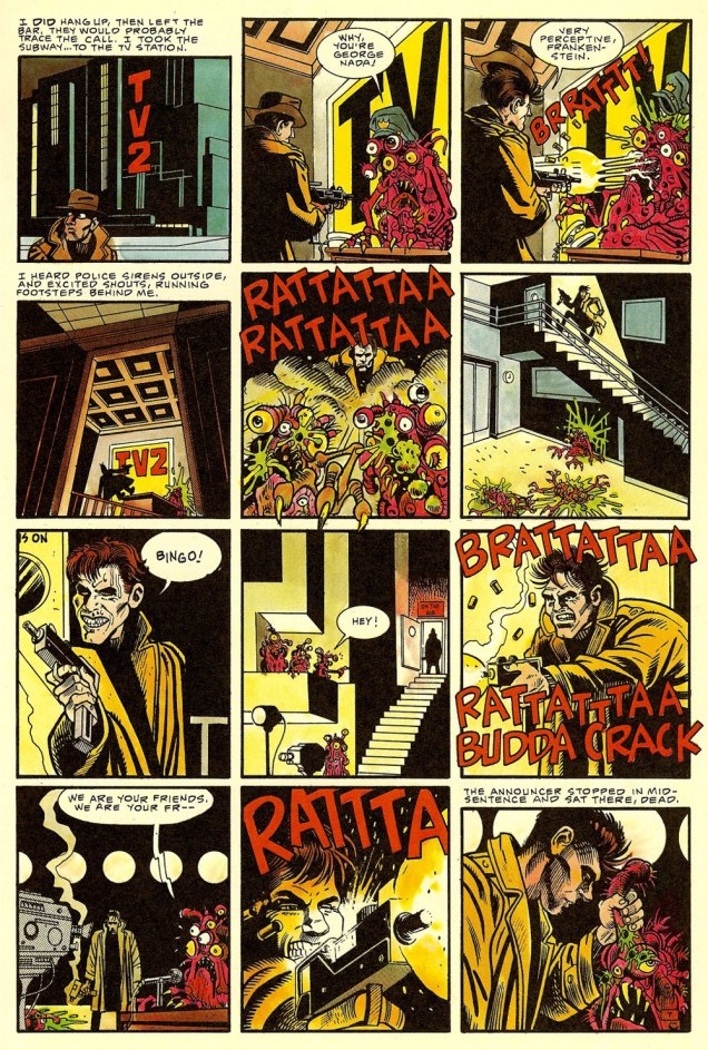 Anyway, Carpenter recounted, in an interview published in the venerable American Cinematographer (Sept. 1988), soon after the film’s release: « They Live began three years ago with a comic book I bought called ‘Nada’. It was published by Eclipse Comics, a company which puts out very beautifully rendered science-fiction stories. This particular strip was taken from a short story called ‘Eight O’Clock in the Morning’ by Ray Nelson. » [ source ]