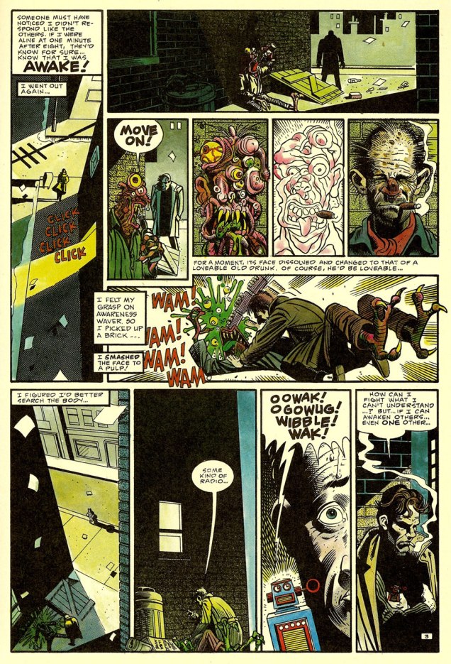 What John Carpenter’s story does, in essence, is add fat, muscle, a brain, and pretty much everything else a living organism needs, to a skeleton in the most literal sense. Everything that fills out John Nada’s back story and makes him seem like an actual person who thinks and feels is all John Carpenter’s idea.