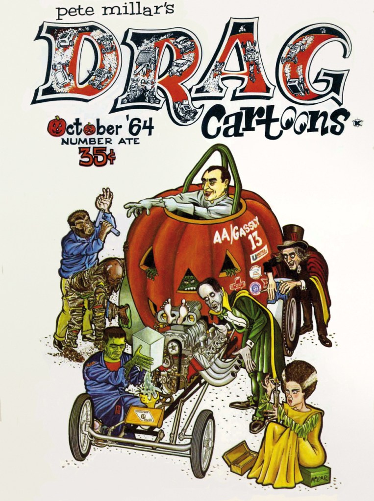 This year, we open hostilities with this fine monster mash by Pete Millar (1929 – 2003), drag-racing cartoonist nonpareil. I suspect we’ll be seeing more of certain members of this ghoulish cast of fiends.