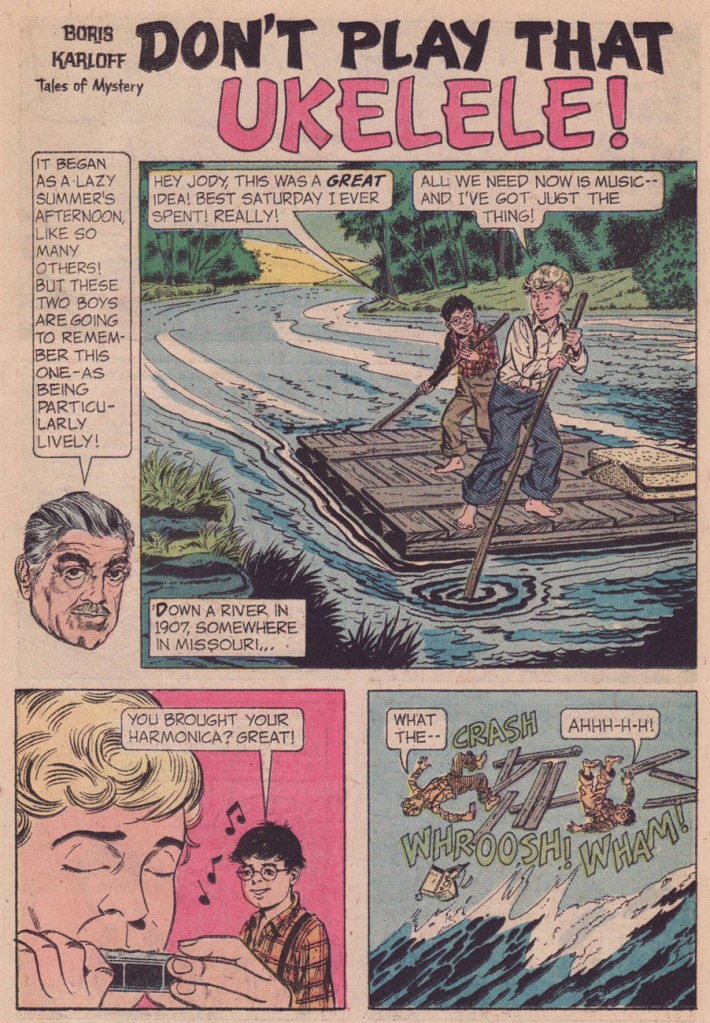 This is Boris Karloff Tales of Mystery no. 64 (Oct. 1975, Gold Key), featuring a painted cover by Argentine master Luis Dominguez. Don’t Play That Ukelele! isn’t even the cover story… there’s just a lot of aquatic peril in this particular issue.