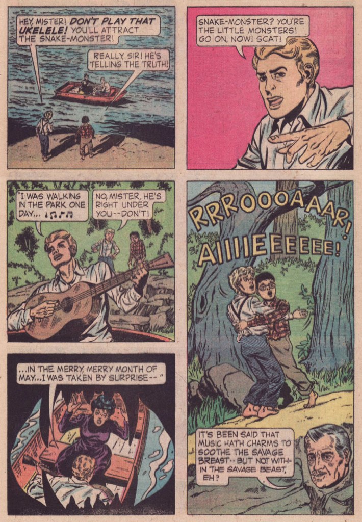 « I absolutely did write “Don’t Play That Ukulele!” But I don’t deserve the ding for the misspelling — that was the letterer’s error, which no one fixed. I will cop to not knowing (in 1975) that the ukulele wasn’t introduced stateside until 1915…but even there the story is a bit more complicated than it appears on the surface. When I pitched the idea it was a guitar that brought doom down on our unfortunate swain, same as it wound up being drawn. But editor Paul Kuhn thought a ukulele was intrinsically funnier than a guitar, and he’s absolutely right about that. I remember us both giggling over the title when we came up with it. »