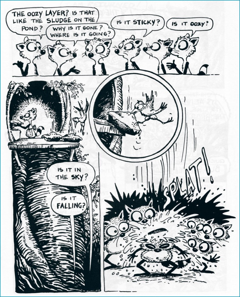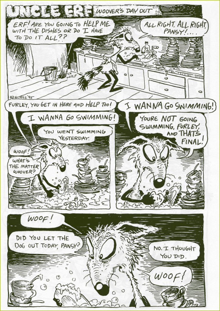 There’s also my favourite, Uncle Erf, who’s also his own wife Pansy and his son Furley, depending on which personality has control at any given moment – and things can shift pretty damn fast. This poor tormented beast is more than just the butt of jokes – Erf/Pansy/Furley is a walking repository of all human foibles, but with something really vulnerable and innocent peeking through the endless ‘family’ conflicts. In Woover’s Day Out (published in no. 5), a new member of the family, a dog named Woover, joins the team. Poor raccoon!