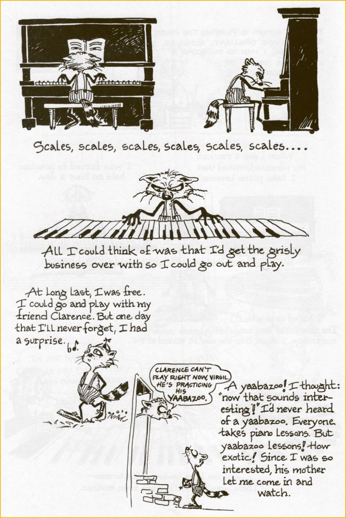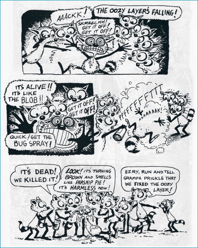 As entertaining as Virgil’s outbursts can be, I prefer to bask in glimpses of the world he inhabits, peopled (raccooned?) by characters young and old. The Natural Raccoon (published in no. 1), featuring Grandpa Prickle (which I tend to call Grandpa Pickle) and nursery of youngsters, makes for a choice example.