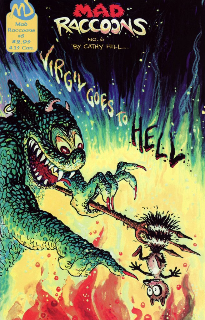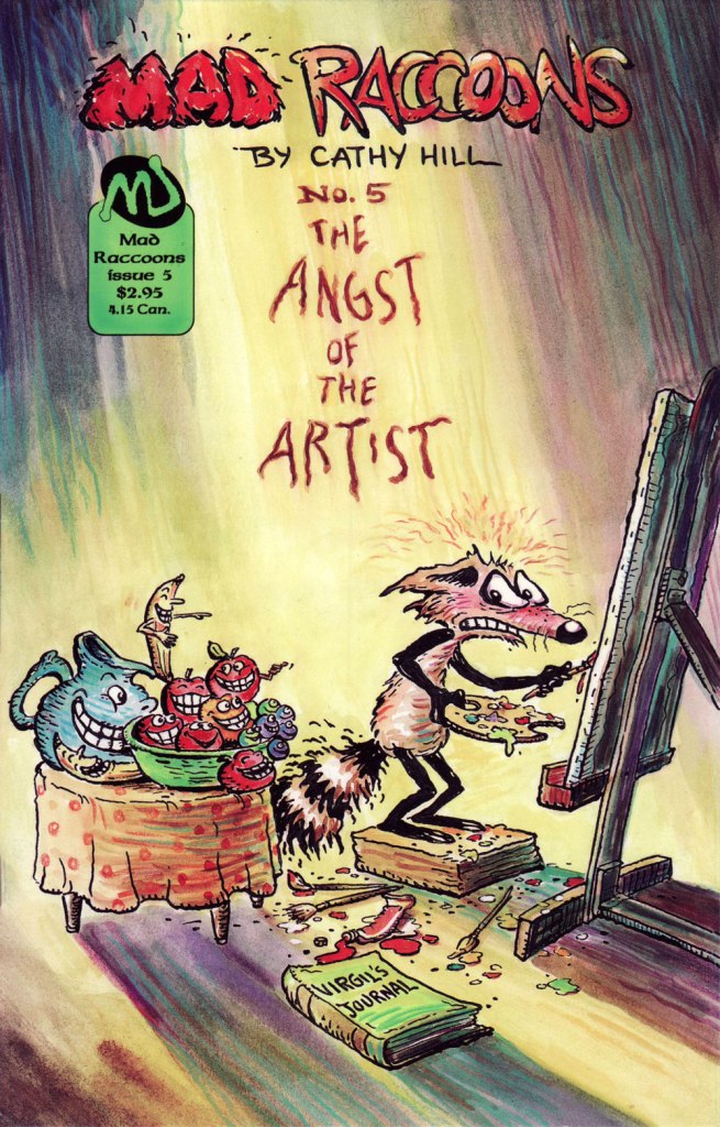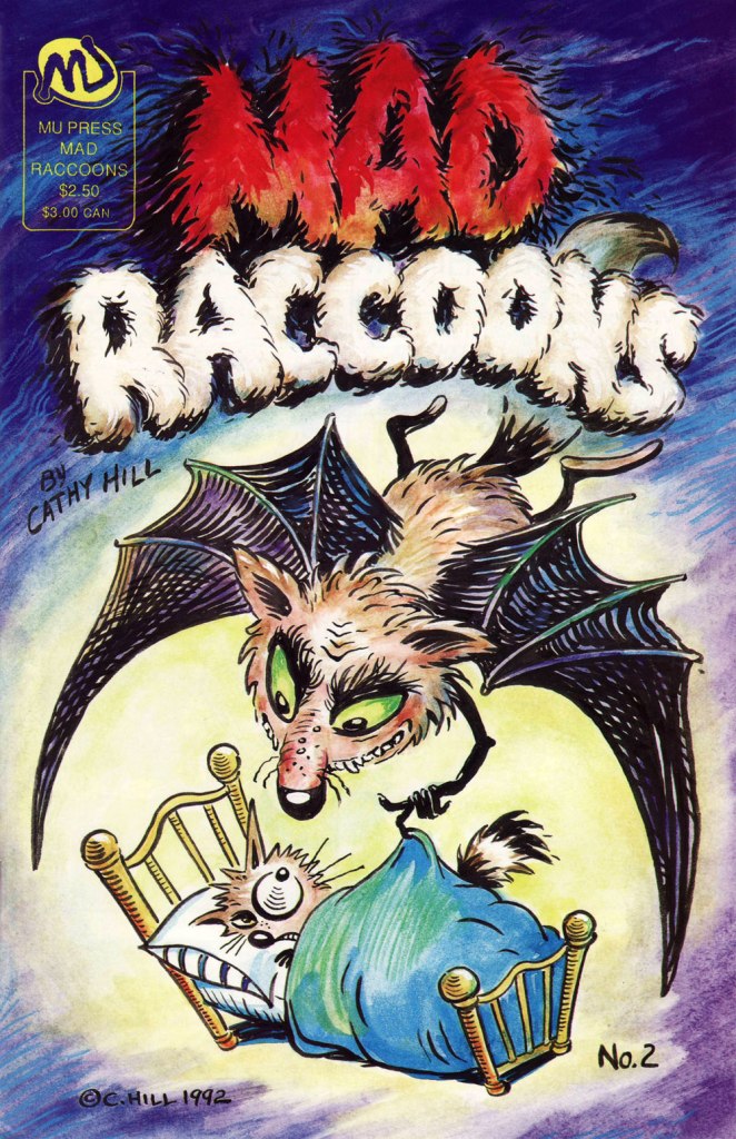 Occasionally, I feel like casting a spotlight on comics long forgotten… assuming that there was some memory to be forgotten in the first place, which is often not even the case. American comics artist and illustrator Cathy Hill set loose seven issues of her charming series Mad Raccoons between 1991 and 1997, but how many have made friends with these raccoons? Her absence on Wikipedia (surely today’s litmus test for fame?) underlines the obscurity of her work. I located a link to a Cathy Hill art exhibition… which seemed promising, as I know that Hill was predominantly a painter who has also drawn covers for SF novels as well as posters for a wide variety of events. Well, it was the wrong Cathy Hill – this one was British. So the cookie crumbles.