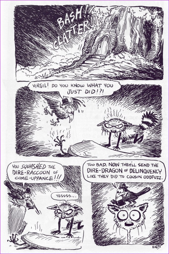 Speaking of tantrums – here are the concluding three pages of Virgil’s Visitor, in which Virgil is visited by the dire-raccoon of comeuppance (published in Mad Raccoons no. 2):