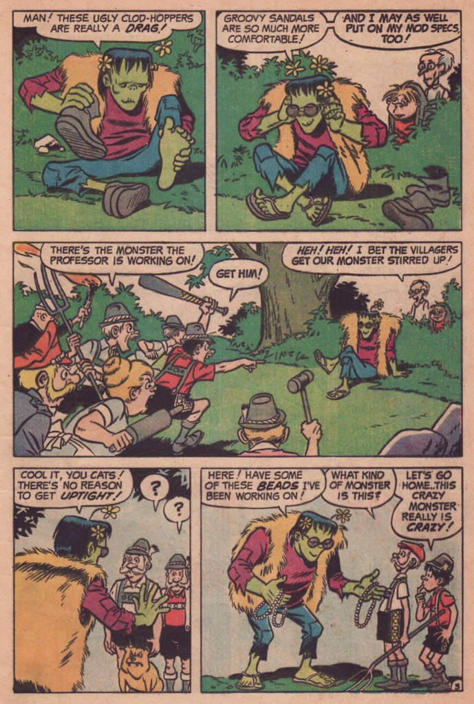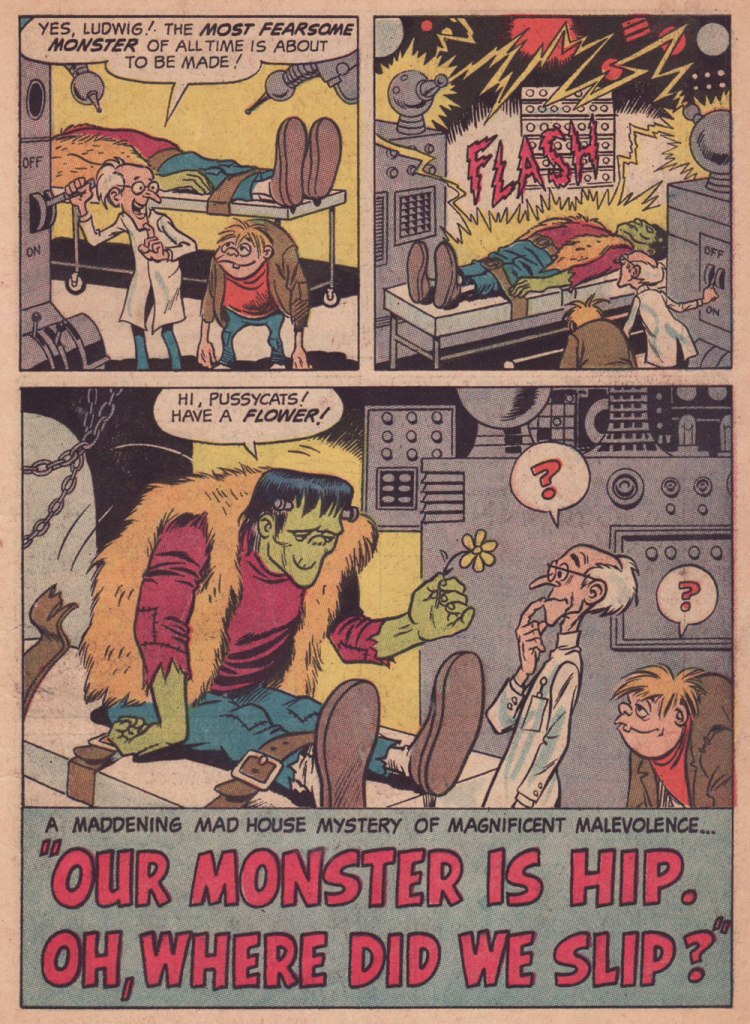 « Our Monster Is Hip. Oh, Where Did We Slip? », most likely scripted by Archie mainstay George Gladir (1925-2013), appeared in Archie’s Madhouse no. 64 (Oct. 1968).