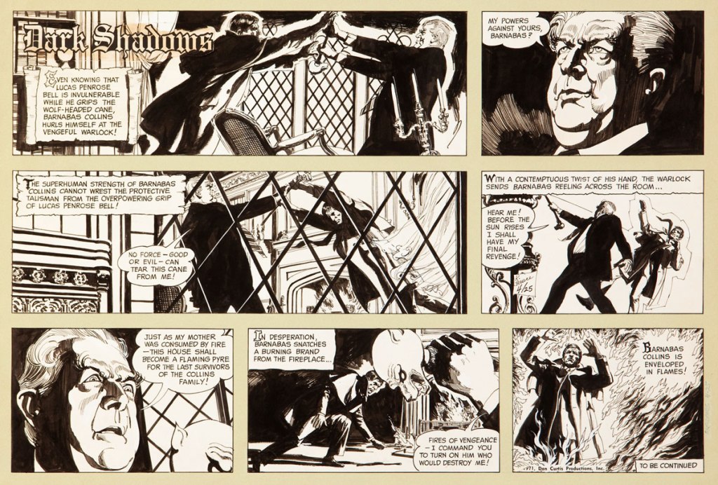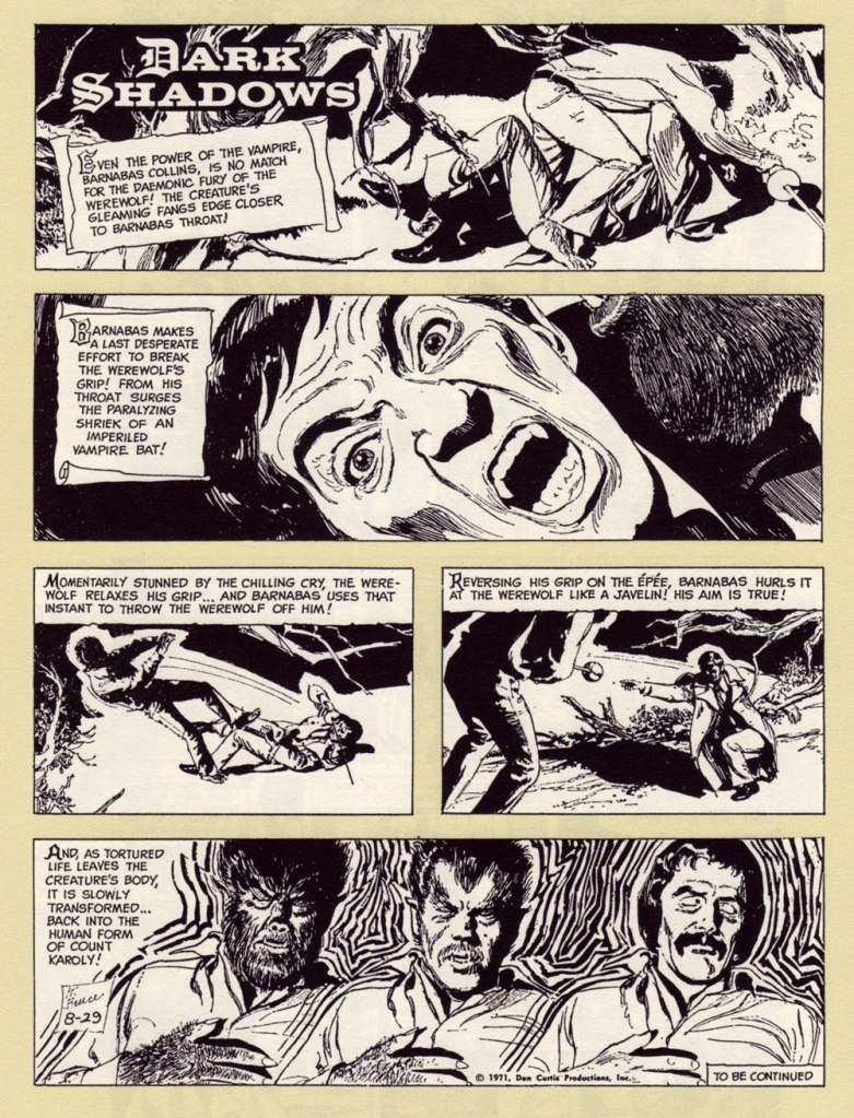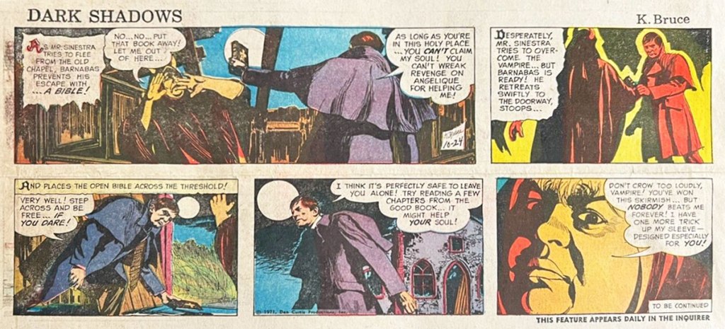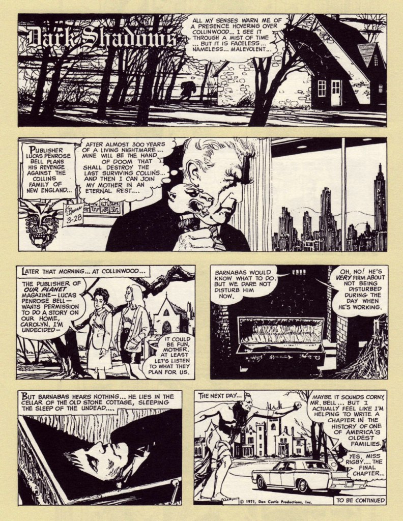 … and speaking of that tormented bloodsucker, Mr. Barnabas Collins — mentioned in passing just yesterday — here’s a look at the short-lived (fifty-two contracted-for weeks, just like Daniel Pinkwater and Tony Auth’s Norb) syndicated strip that appeared at the tail end of Dan Curtis‘ preeminent supernatural soap opera‘s run (1966-71). The strip was likely scripted — at least in part — by Little Abner creator Al Capp‘s prolific brother Elliot Caplin (who also had a hand in the creation of Russell Myers’ Broom Hilda around the same time!)