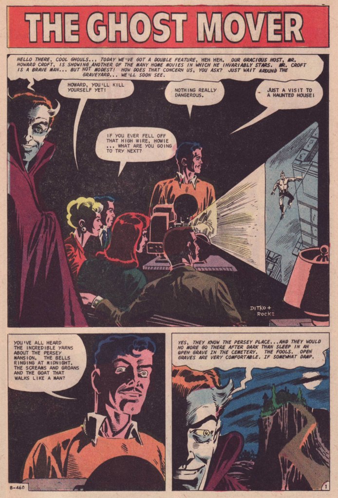 I’ve always adored this one for its adroit juggling of hushed atmosphere and giggles, its casually dropped hints and layered subtlety. Ditko really had no peer when it came to insinuating his narrator into the visual tapestry. In this case, his first and finest host, Mr. L. Dedd (or I. M. Dedd, depending on the source). Ditko is clearly having a ball.