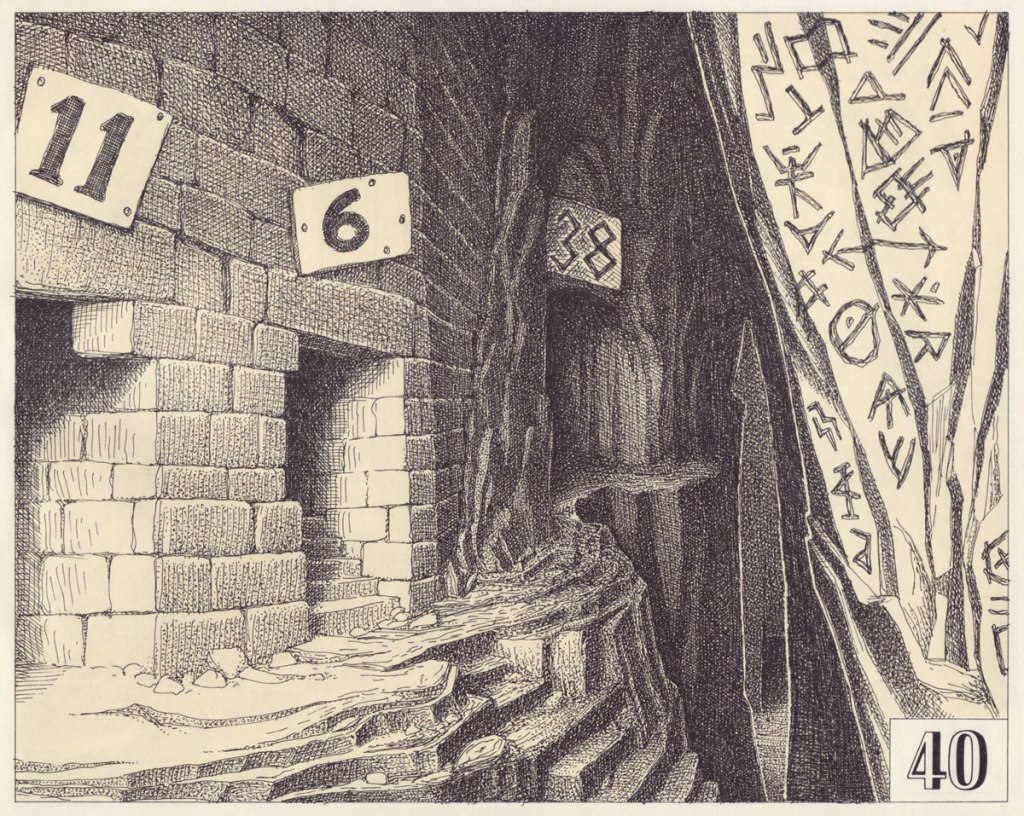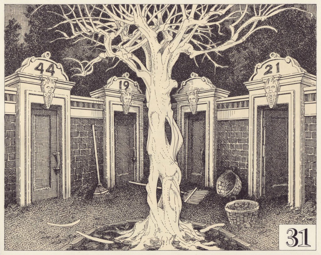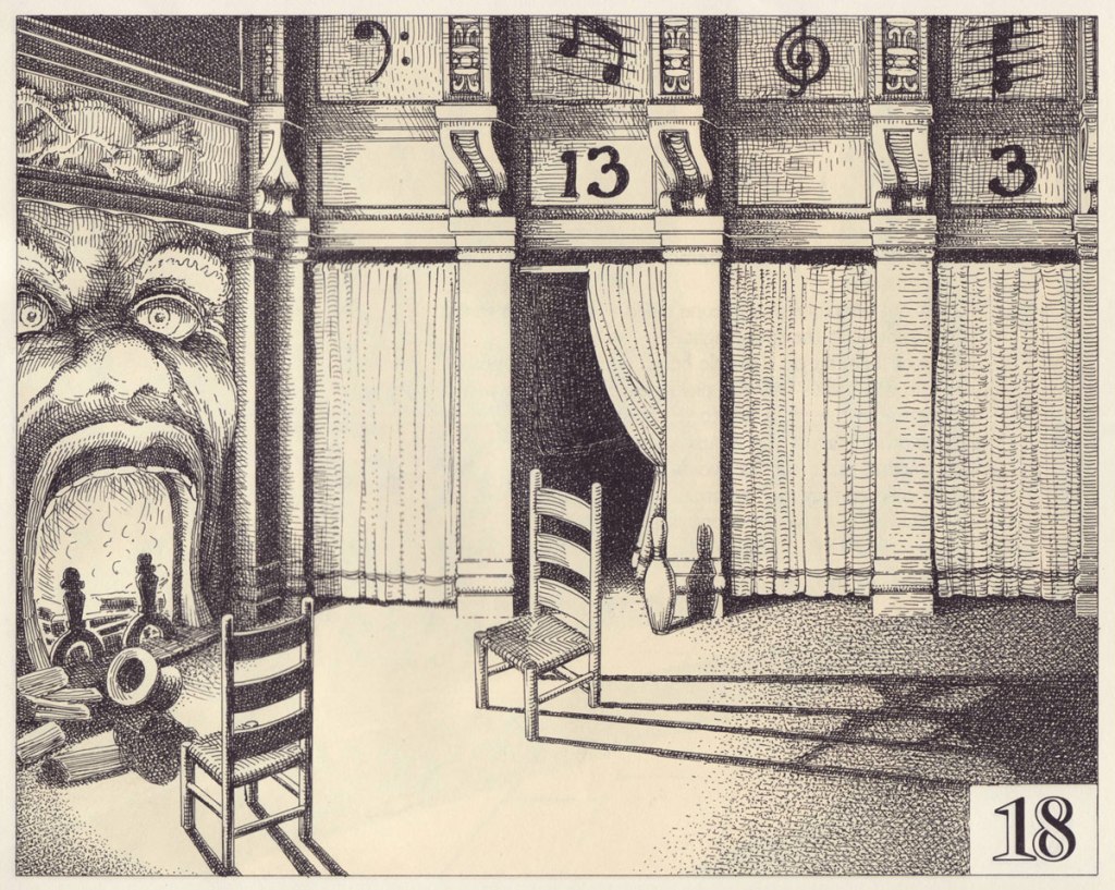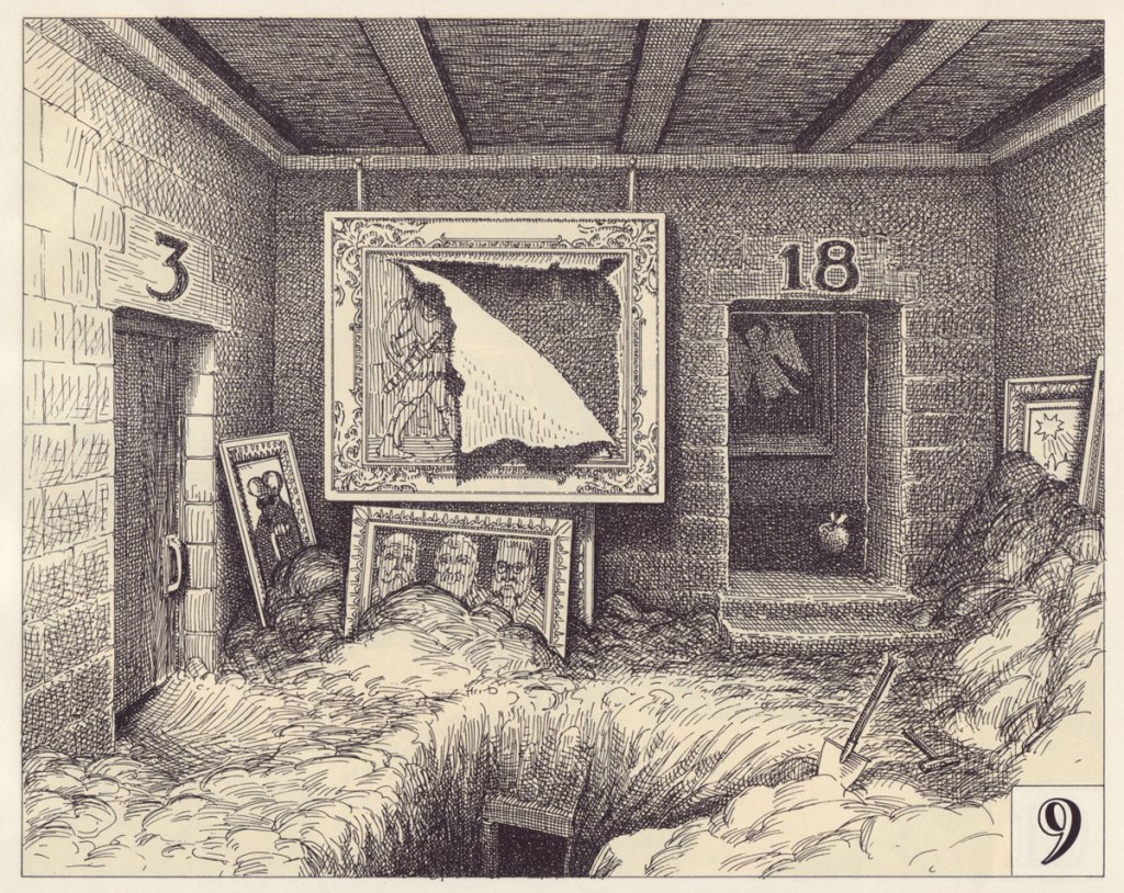 « … a gloomy, cavelike place far underground. Even I was oppressed by the weight that hung over our heads. A very small hole, high above, admitted a feeble light. »« … what appeared to be an old storeroom. Dust obscured a damaged painting, making it hard to understand just what the artist had intended. »« … one of the biggest rooms in the House. All three doorways were dark. “Afraid to go out?” I asked. »« … a much warmer room. Shadows danced across the floor to the fire’s music. »« … a dramatic room with four entrances and exits. “Not enough light in here,” they remarked. “Not very tidy either.” »« … a darkened chamber dominated by a large figure. We could see that someone had been working here recently; the entrance I had so carefully hidden had been uncovered. I made a note to return as soon as I could and fill in the hole again. »« … a melancholy little courtyard surrounded by a brick wall too high to see over. A dead tree lifted its bone-white branches to a sky filling with gray clouds. »« … what appeared to be someone’s basement. One of them sank gratefully down on an old couch which promptly collapsed. »« … the foundations of the Maze. Deep underground stones had been carved and fitted; passage opened in the natural rock. »
