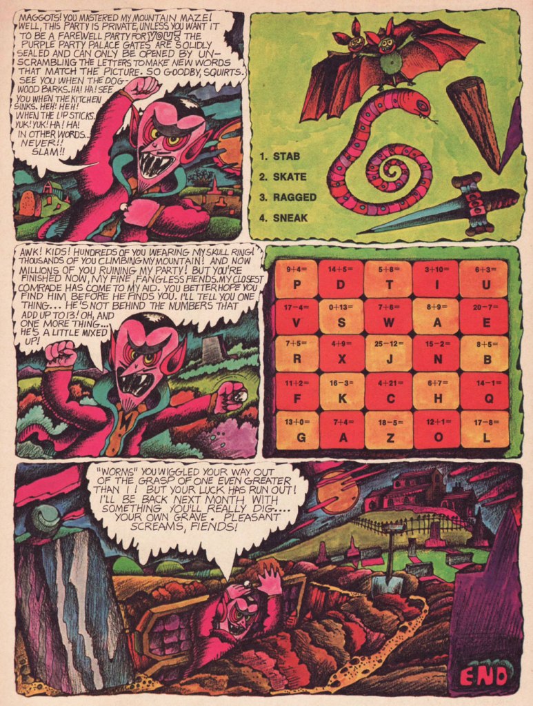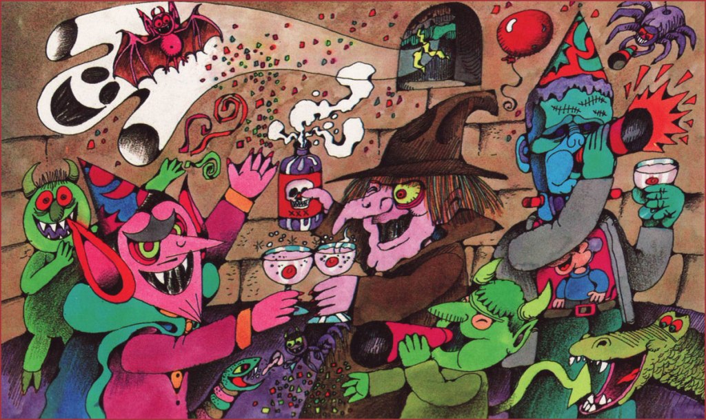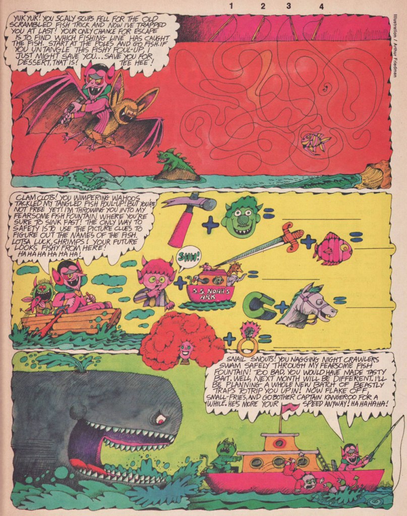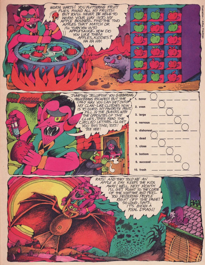 An earlier, darker (so to speak) version of Morbida, which appeared in Dynamite no. 5 (Nov. 1974, Scholastic). All text by Linda Williams Aber and illustrations by Arthur Friedman.The Count tries his hand at operating a fruit stand in Dynamite no. 21 (March 1976, Scholastic).Morbida went to the hop in Dynamite no. 24 (June 1976, Scholastic), cover-featuring Elvis the Pelvis.This lovely Holiday greeting card was provided with Dynamite no. 30 (Dec. 1976, Scholastic). The Count is all at sea in Dynamite no. 33 (March 1977, Scholastic), which cover-featured The Captain and Tennille!This sheet of party stickers was throw in with Dynamite no. 12 (June 1975, Scholastic), which cover-featured the good Count.