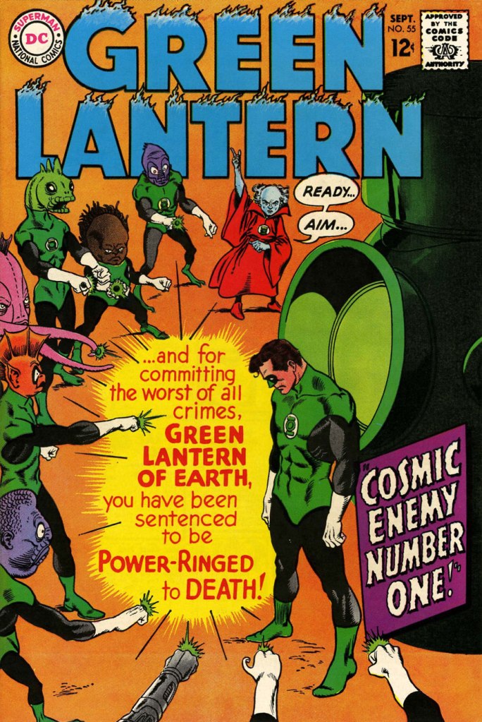 So we turn today’s spotlight on a hot streak of seven. Kane gets his name in the title, but it would be more accurate to say they were Infantino-designed, Gaspar Saladino-lettered, Jack Adler-coloured, Gil Kane-pencilled and Murphy Anderson and Sid Greene-inked covers. The streak begins after Green Lantern no. 54’s downright poor cover, and ends with the interruption of Kane’s impressively long run of consecutive issues.