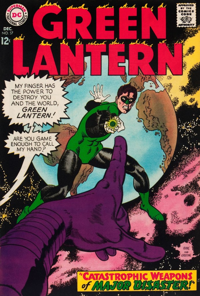 This is Green Lantern no. 57 (Dec. 1967, DC), featuring Catastrophic Weapons of Major Disaster!, written by Gardner Fox, pencilled and inked by Kane. Cover by Kane and Greene… love the placement of the signatures!