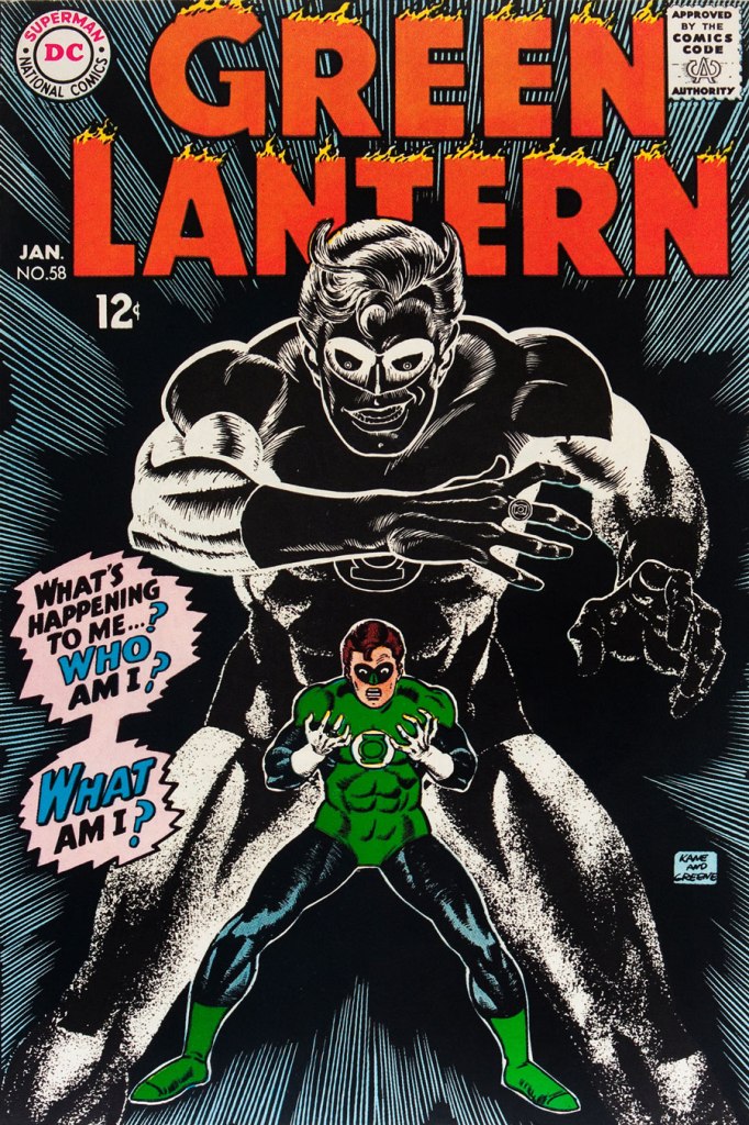 This is Green Lantern no. 60 (April 1968, DC); an evident Infantino design, with pencils by Kane and inks by Anderson… which interestingly ends up producing a prototype of Brian Bolland‘s distinctive style… a decade early.