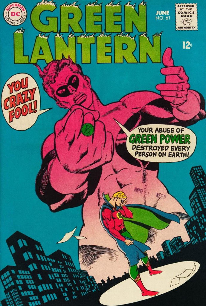 It’s a shame that Kane and his former classmate at the School of Industrial Art (back in the early 40s!), DC lynchpin Carmine Infantino didn’t get on too well, because their Silver Age collaborations had a special spark… must have been the animosity. It had been noted by the DC brass, as early as the late 50s, that Carmine’s covers reliably caught prospective buyers’ attention and dimes. And so, by 1967, he was unofficially designing most of the publisher’s covers, and certainly the covers of all titles edited by Julius Schwartz. Green Lantern was among these.