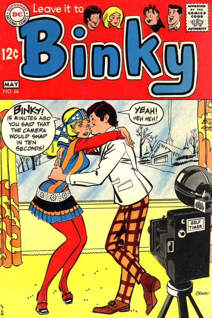 And then it was over, in this visual idiom anyway: with the following issue (LITB68), DC brought in well-traveled Henry Scarpelli to handle the covers and create the impression that Binky was just one more Archie clone. Over the subsequent four issues, a handful of (pretty good) new stories were mixed in with the reprints. Then came a change of title and a new logo. The book, now simply called Binky, was a full-on Archie ersatz, and lasted another ten issues into 1971… with one final special popping out of nowhere in the summer of ’77. For ol’ Binky, par for the course!