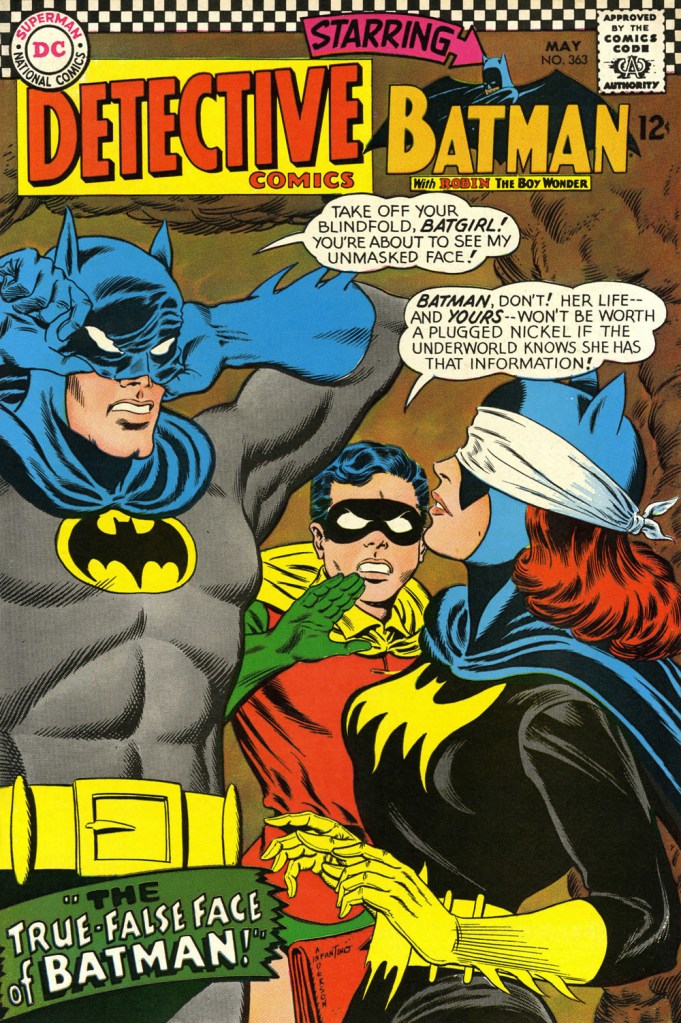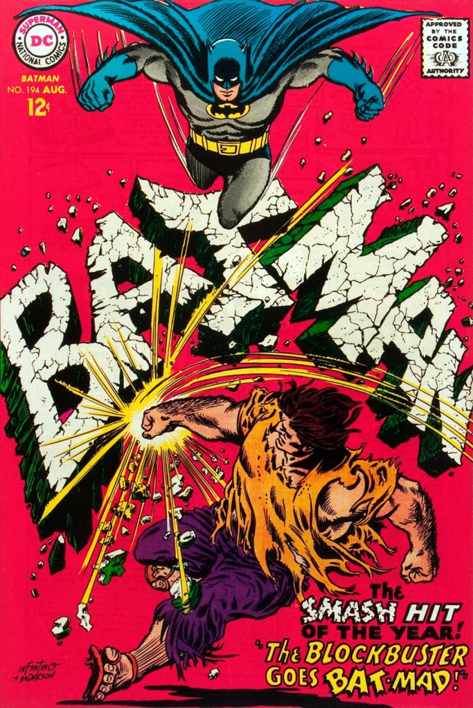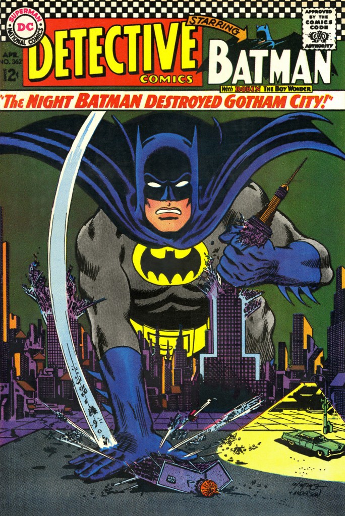 This is Detective Comics no. 362 (Apr. 1967, DC), pencilled by Infantino and inked by Murphy Anderson. Carmine wasn’t a fan of the so-called ‘Go-Go Checks’, that checkerboard pattern that once famously adorned those distinctive yellow NYC cabs. He didn’t mince words, either: « What a ridiculous thing: it was the stupidest idea we ever heard because the books were bad in those days and that just showed people right off what not to buy. ». Certainly, in the case of Detective Comics, they left the top of the page far too cluttered.This is Detective Comics no. 363 (May 1967, DC), featuring (this) Batgirl‘s second appearance. She’d been created by editor Julius Schwartz and Infantino at the request of the hit Batman TV show‘s producers, figuring that the series needed a heroine for a little extra spice. Art by Infantino and Anderson.This is Detective Comics no. 364 (June 1967, DC). Roy Reynolds, alias The Getaway Genius, was a fun civilian villain whose finest hour, in my view, came at the tail end of 1973 with Batman no. 254‘s King of the Gotham Jungle! (written by Frank Robbins, pencilled by Irv Novick and inked by Dick Giordano), when he was unexpectedly caught between the Batman and the Man-Bat. I wouldn’t be surprised to learn that a Batmaniac or three had reconstructed this Joker edifice in their backyard or basement, out of Lego blocks or papier mâché… or actual bricks.