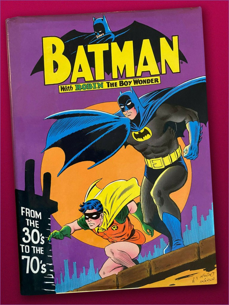 This is Detective Comics no. 368 (Oct. 1967, DC). Infantino reportedly created the covers first, and editor Schwartz assigned his writers to work up a scenario to fit. This one could not have been a cakewalk. Gardner Fox was the unlucky recipient of that gargantuan task.Since it’s not an issue of Detective, this cover’s not *technically* part of the streak… but as it features Batman, and it appeared between issues 365 and 366 of Detective, I’m throwing it in. Infantino and Anderson’s literal and figurative blockbuster of a cover for Batman no. 194 (Aug. 1967, DC). Its cover aside, a pretty ho-hum issue. The book and the character were in urgent need of another overhaul, and it was just around the corner. « When Donenfeld saw this cover, he had a fit! He said, ‘I don’t see the logo on top!’ I said ‘You don’t have to — you’ve got Batman up there!’ »Aw, heck — here’s Ira Shnapp’s accompanying house ad, a work of art in itself, wouldn’t you agree?Speaking of immortal Infantino Batman images: « Aurora wanted action shots of their models, so I did this rough layout, sent it to them, and they liked it! I had a moon behind him, but they dropped it. The tree created the design. I was very high into design at this point (1964) — the design was pouring out of me! ». Here’s a look at the finished model.I couldn’t very well leave out what’s possibly the most famous of Carmine’s Bat-scenes: this is Batman From the 30s to the 70s (1971, Crown Publishers) a splendid hardcover anthology. Its cover adapts an Infantino-Anderson mini-poster that originally saw print in Detective Comics no. 352 (June 1966, DC) and bore instead the inscription « Best Bat-Wishes Batman and Robin ». Superman, Wonder Woman and Captain Marvel, er… ‘Shazam’ also got their own historical anthology in this format.