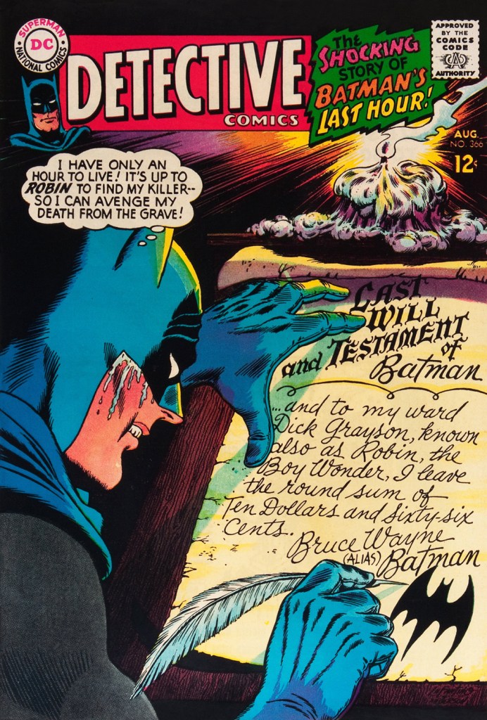 Carmine really went to town on this one, and it’s rightly earned its place in the hall of classics. This is Detective Comics no. 365 (July, 1967, DC). The cover story, The House the Joker Built! is scripted by John Broome, pencilled by Bob Kane ghost Sheldon “Shelly” Moldoff and inked by Joe Giella.Speaking of design, here’s the masterful Ira Schnapp‘s house ad for Detective 365, as it appeared in Green Lantern no. 54 (July, 1967, DC), among other titles.This is Detective Comics no. 366 (Aug. 1967, DC); I love those moody colours and light effects, that tell-tale Infantino candle and the mysteriously parsimonious inheritance bequeathed to Robin.This is Detective Comics no. 367 (Sept. 1967, DC), an intriguing preview of Where There’s a Will — There’s a Slay!, written by Gardner Fox, pencilled by Infantino, inked by Sid Greene. I wonder how many young readers enthusiastically destroyed the cover to assemble the puzzle…
