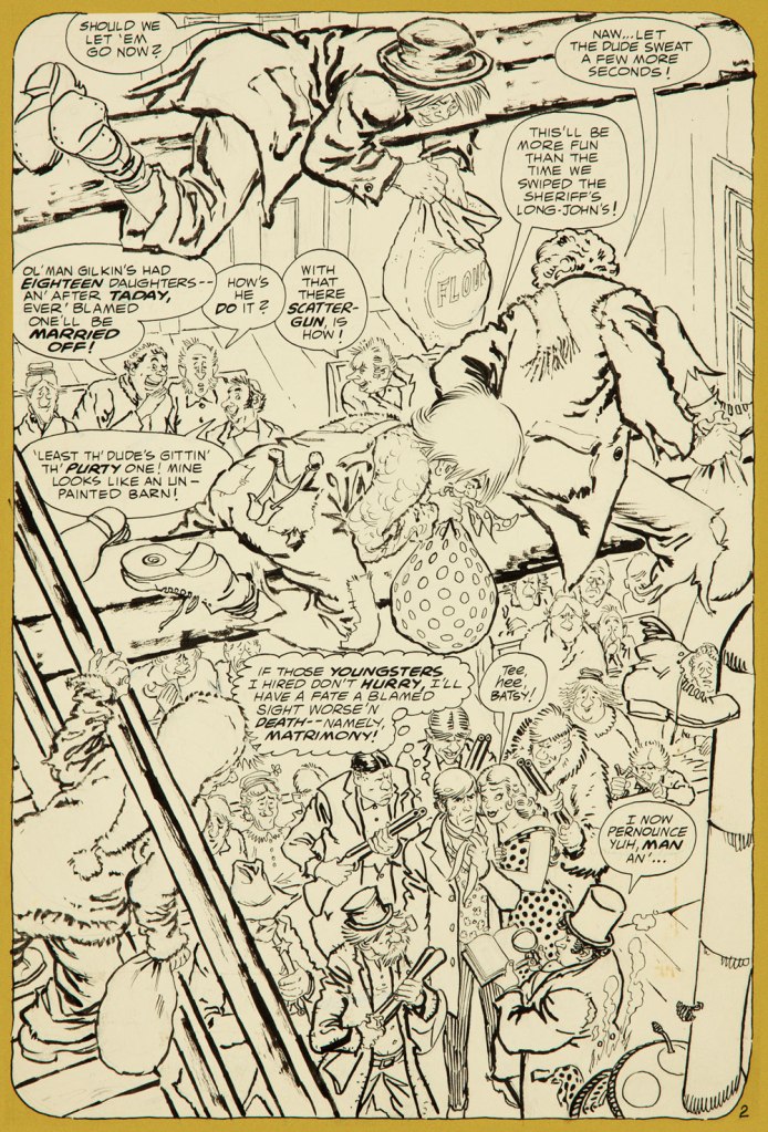 From issue 7, editor Orlando gives us some cheeky insight into the creation of an issue of Bat Lash.And plotter Aragonés provides some visual direction. To give you a sense of the less flippant, but not altogether grim, tone of the later issues, this is page two from issue 7. DC Comics of that period were quite ambitious with the limited means of the four-colour reproduction process, using plenty of backlighting and projected light… quite another level.