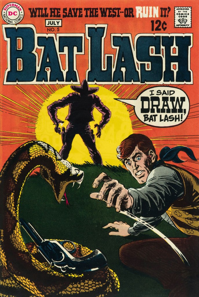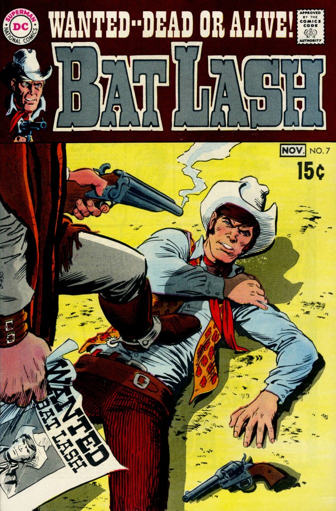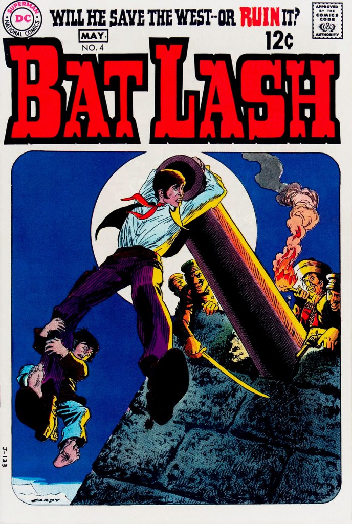 Our streak begins with Bat Lash no. 2 (Dec. 1968-Jan. 1969, DC) since the covers of Showcase no. 76 and Bat Lash no. 1 were good, but not — imho — great. I daresay this one is, in fact, the finest of the lot, with Cardy at his most Tothian.A peek inside the same issue, for contrast: lively and loose inking over rock-solid pencilling, and miles away from the tone of the cover. My guess is that some people weren’t happy.Bat Lash no. 3 (Feb.-Mar. 1969, DC) highlights the comedic side of the feature, which all but evaporated by the last two issues.This is Bat Lash no. 4 (Apr.-May. 1969, DC). Dig Cardy’s expert use of the ‘drybrush‘ technique on the stones.This is Bat Lash no. 5 (June-July 1969, DC). I’m reminded of a similar, later cover featuring one of Bat’s successors, Jonah Hex. The price goes up and the comedy… just goes. This is Bat Lash no. 6 (Aug.-Sept. 1969, DC).… and there goes the original tagline. This is the final issue, Bat Lash no. 7 (Oct.-Nov. 1969, DC)… and so must end this particular hot streak.