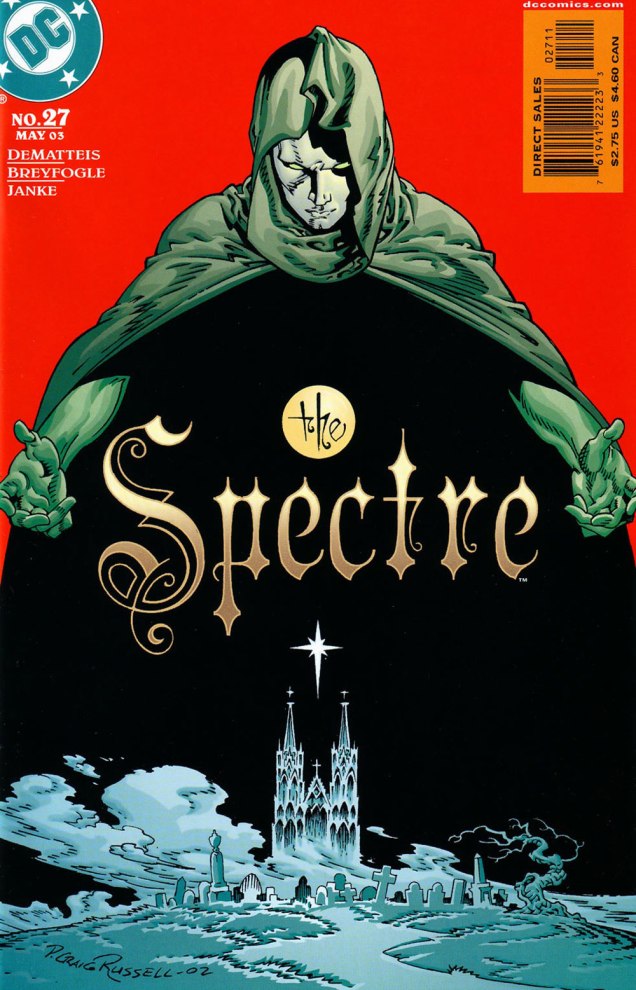 Hey, something from this century! This is The Spectre no. 19 (Sept. 2002, DC). A nice bit of Kirby tribute on Darkseid. In this case, and in fact throughout the Russell sequence, the expressive colours are the work of Lovern Kindzierski.This is The Spectre no. 20 (Oct. 2002, DC). It’s worth pointing out the added value of Russell being a consummate letterer/font designer. Without a logo set in stone (as is generally the case, usually at the insistence of the marketing department) the savvy artist benefits from the extra freedom of counting the title logo among the moving parts of his design. Cue the de rigueurWill Eisner/Abe Kanegson mention.This is The Spectre no. 21 (Nov. 2002, DC). When I showed her these, ds expressed some surprise at her failing to devote a Tentacle Tuesday Masters entry to Mr. Russell.This is The Spectre no. 22 (Dec. 2002, DC).This is The Spectre no. 23 (Jan. 2003, DC).This is The Spectre no. 24 (Feb. 2003, DC).This is The Spectre no. 25 (Mar. 2003, DC).This is The Spectre no. 26 (Apr. 2003, DC).This is The Spectre no. 27 (May 2003, DC). Thus ends the streak…. with the series.