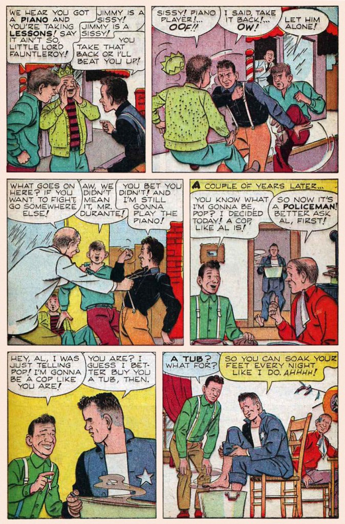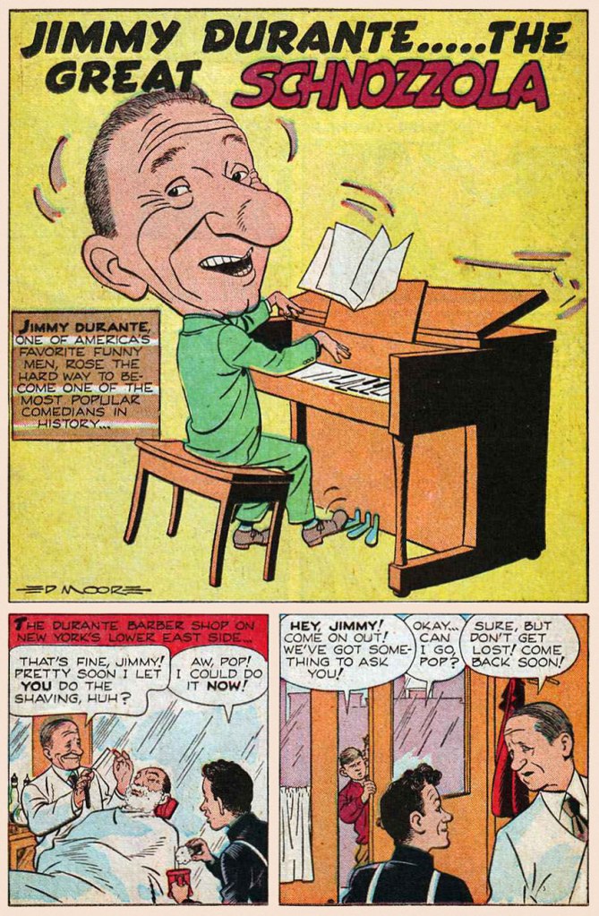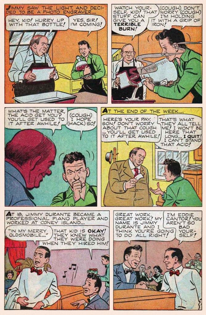 This early bit of biography appeared in Juke Box Comics no. 4 (Sept. 1948, Eastern Color); it was illustrated by Ed Moore. Hear Cantor and Durante reminisce about their early days on this 1947 episode of The Jimmy Durante Show.