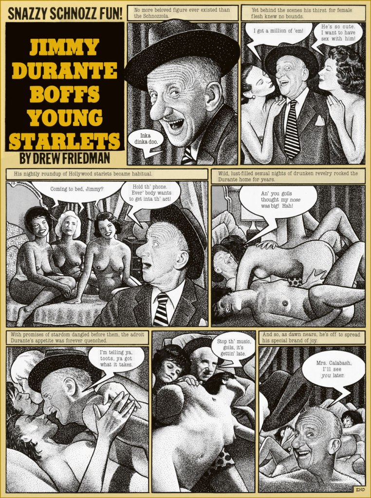Pointillist-satirist Drew Friedman‘s immortal Jimmy Durante Boffs Young Starlets first saw print in National Lampoon vol. 2 no. 78 (Jan. 1985).