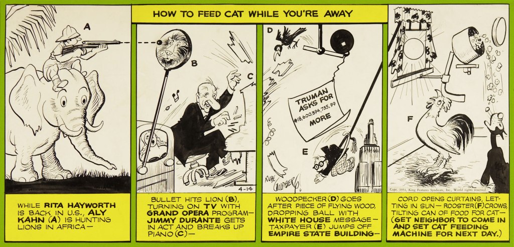 Mr. Durante rates a smashing musical appearance in this Rube Goldberg Device daily strip (Apr. 14, 1951, King Features Syndicate)… by Rube Goldberg, naturally.