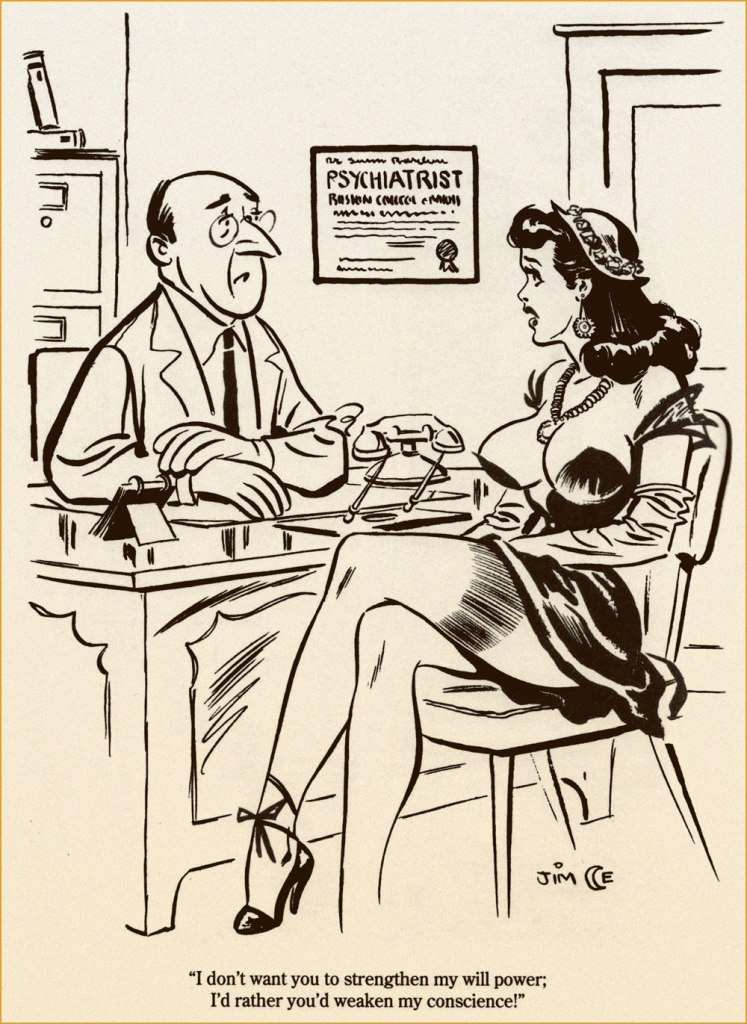 The ending is daft… and at the same time, inspired lunacy that takes it to another level. While I’m drawing from a 1974 reprint, here’s the cover from its original publication, Spellbound no. 13 (March 1953, Atlas); cover pencilled and inked by Carl Burgos, colours by Stan Goldberg. Working in the Goodman Family salt mines (in this case, the Humorama line of ‘girlie’ digests, at ten bucks a cartoon, writing included), Mooney was probably more in his element, nimbly bridging the cartoonish and more academic semi-realism, not a common skill!