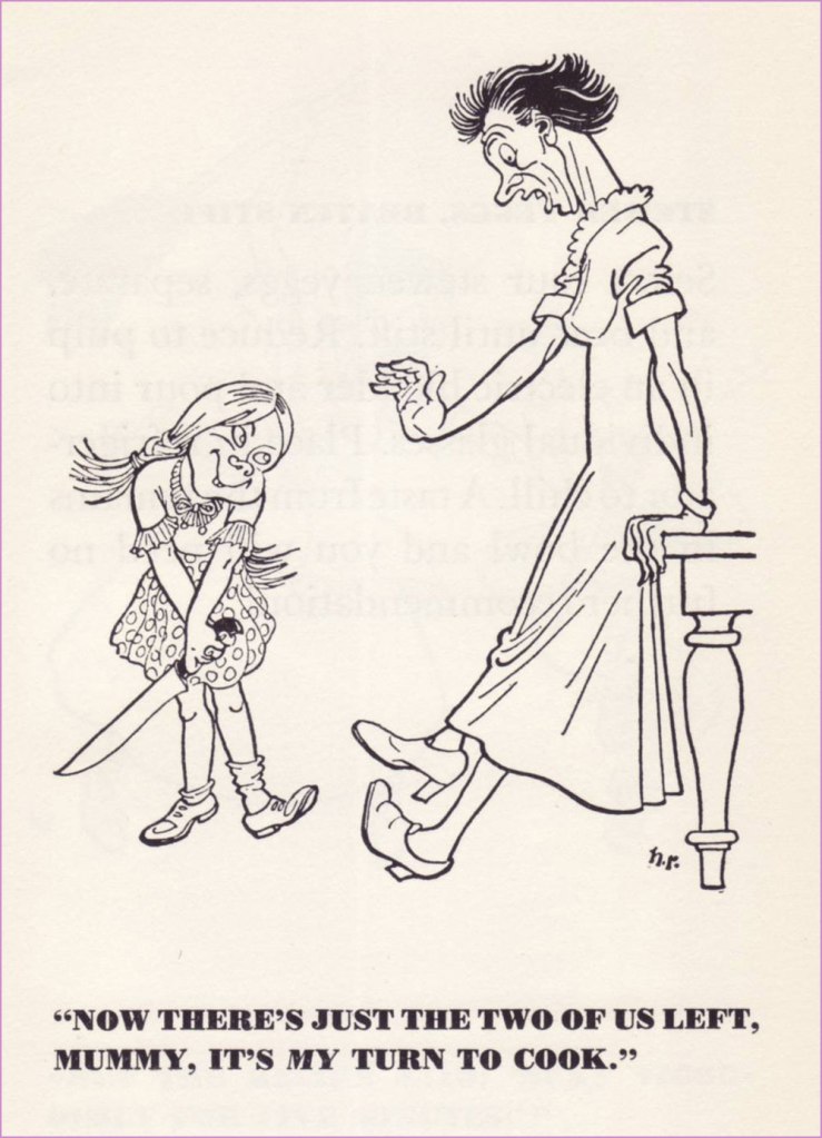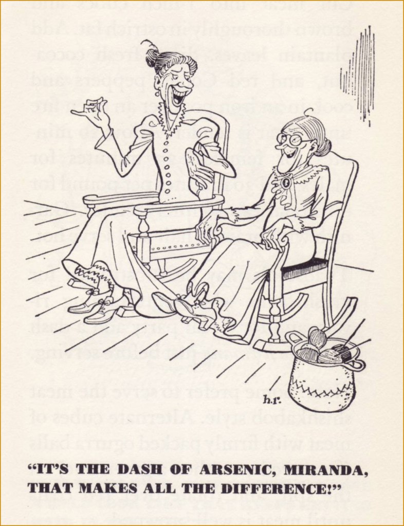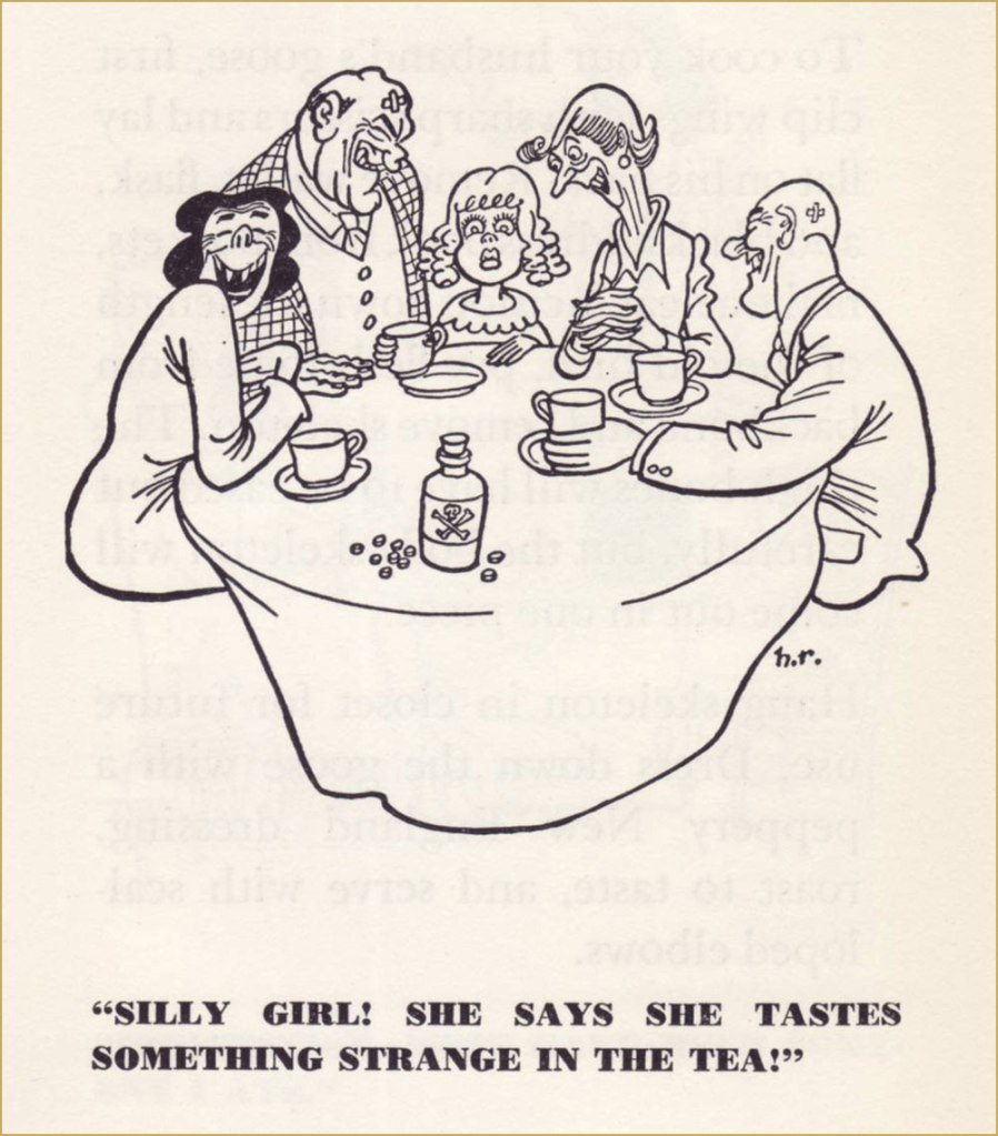 « Anybody can kill vulgarly. But we should be above the brutal, the direct, the unappetizing approach. This little book will teach you to tickle the palates of your guests so that they will be happy to linger at your table, charmed to malinger, and grateful to take off for the Great Adventure with the taste of your superlative cooking still on their lips! » — from Prof. Ebezener Murgatroyd’s preface to his ‘gentle reader’.