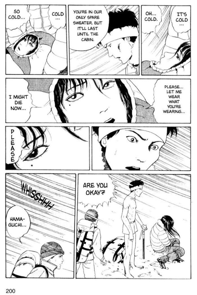 Revenge, originally published in the June 1993 issue of manga magazine Monthly Halloween, is standard Ito fare, and concerns itself with a woman so beautiful that she drives people to madness… in this case, the notorious Tomie, who dispatches a few new victims and nibbles on a wee bit of human flesh in this snowbound vignette.
