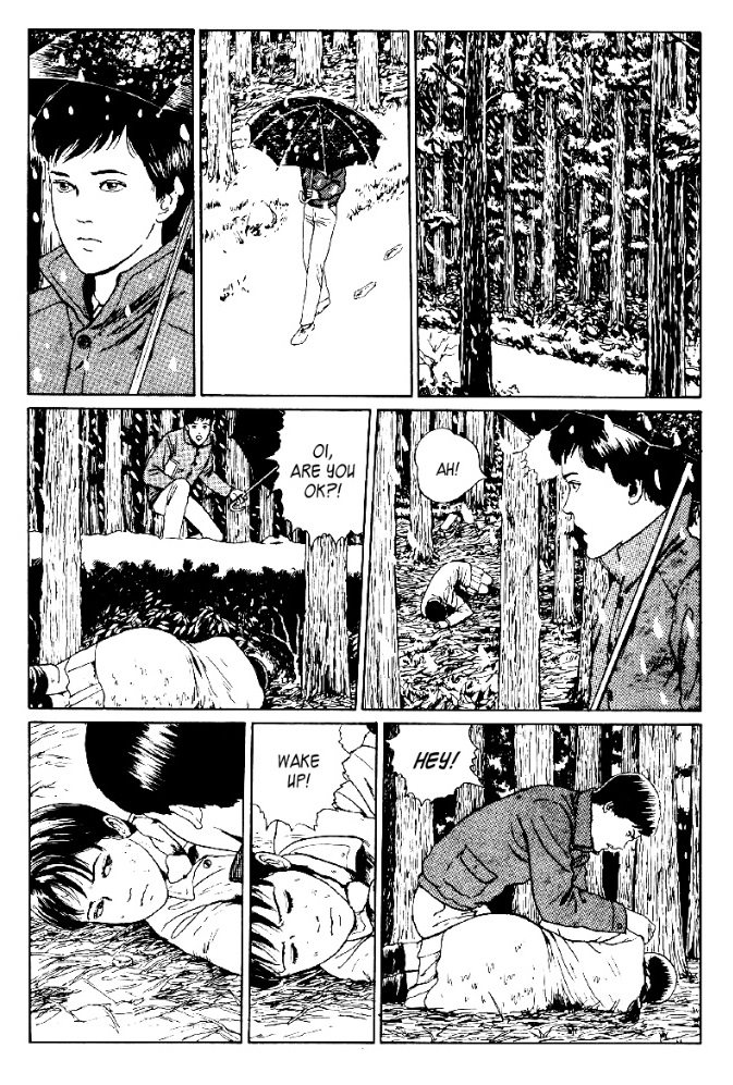 Here are a few pages from Fun Winter Vacation, a chapter/self-contained story from Souichi’s Diary of Delights (1997). Souichi is a little creep with more than a slight penchant for the occult, so weird shit happens whenever he is present. That’s him hiding behind the tree in the first panel – fetching lad, isn’t he? One might say he brings people’s darkest thoughts out into the open. You can read the full story here (remember to read right to left!) I’ve heard some readers complain that this narrative doesn’t quite make sense… welcome to Ito’s dreamlike logic. These episodes are meant to be absorbed like a nightmare one can’t quite wake up from, not dissected in the manner of an A leads to B equation.