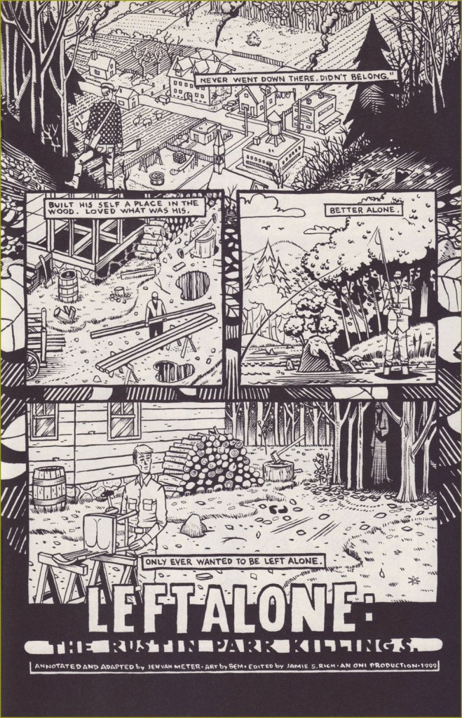 Left Alone: The Rustin Park Killings, written by Jennifer Van Meter and illustrated by Mireault, appeared in The Blair Witch Project no. 1 (Oni Press, July 1999).