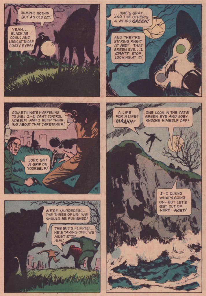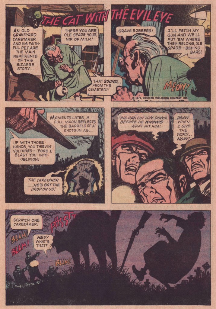 And never did he cut loose more expressively than with this tale of « The Cat with the Evil Eye », from The Twilight Zone no. 38 (July 1971, Western). Working from a barebones scenario by the über-prolific Paul S. Newman, Win messes around with shapes and textures at a breakneck pace. Four pages flicker by and it’s all over but the mournful yowling.
