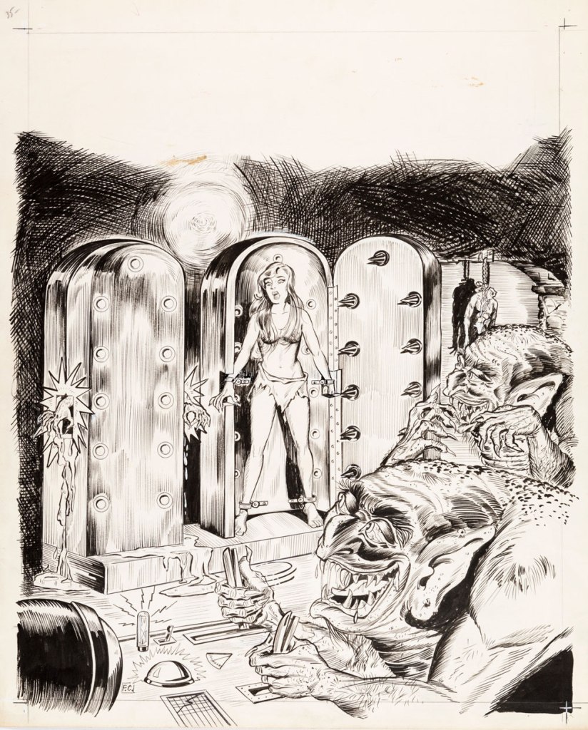« Veteran genre-crosser Carin delivered this new-for-1970 cover, insinuating troll-like creeps into a mad-doctor/torture-chamber situation. (The published version contains a touch of self-censorship, obscuring one conspicuous element of nudity with layers of color.) Carin is an enigmatic figure in midcentury comics, traversing the idioms of Funny Animals, Good Girl Art, adventure, and lurid shock value. » [ source ]