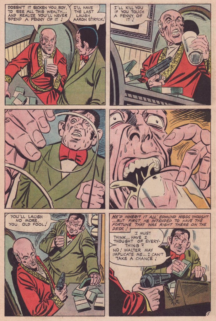Yes, it’s your basic ‘greedy relative’ plot, but perfectly executed. And the late Mr. Strick would surely concur about the ‘perfectly executed’ part. And since the cover gives away a bit too much, here it is, after the story. This is Ghostly Tales no. 103 (Apr. 1973, Charlton). Cover by Steve Ditko, naturally.