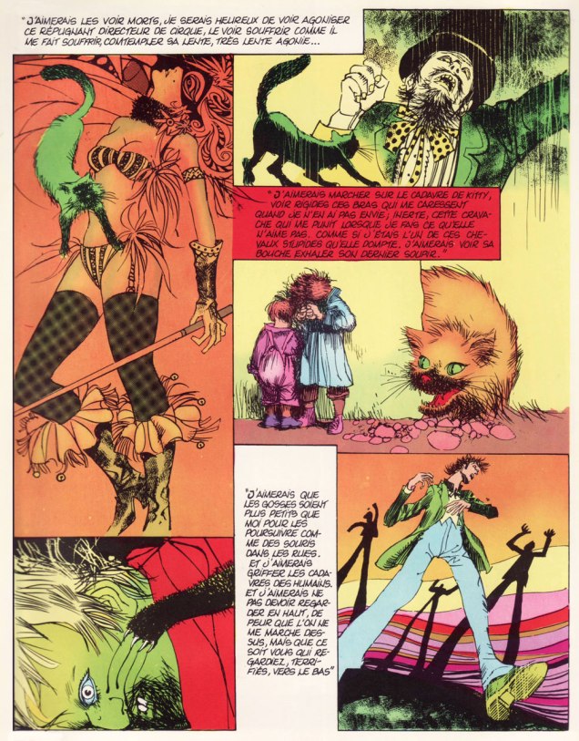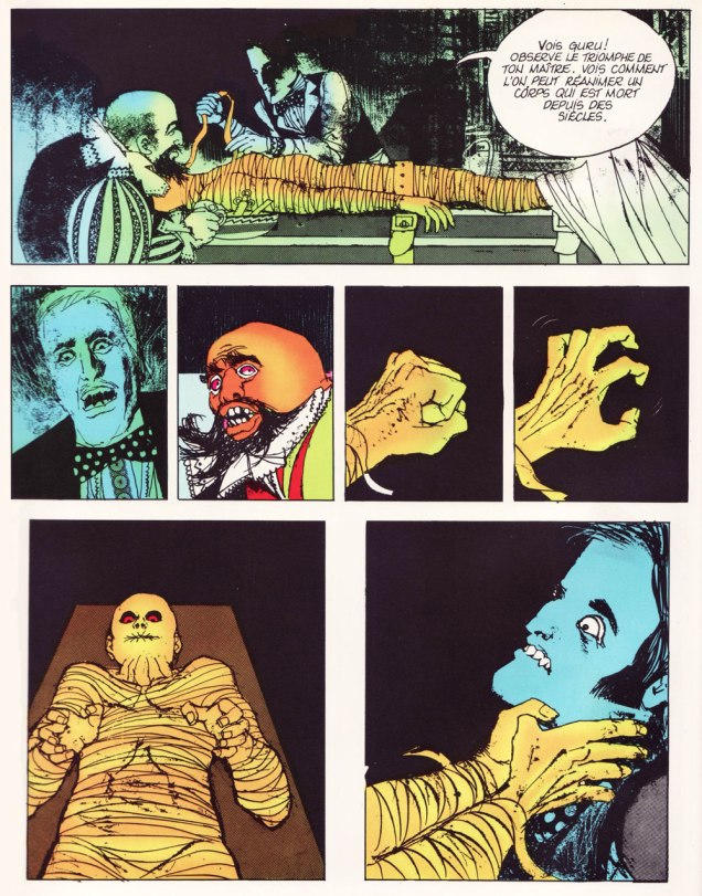 Today’s offering features plenty of colour… which in my humble opinion does not detract in the slightest from a sombre, autumnal atmosphere with chills as palpable as thick mist. While you would not be amiss in deciding that this art comes from a European hand, it’s not a French one, despite the language most of the following pages are in.