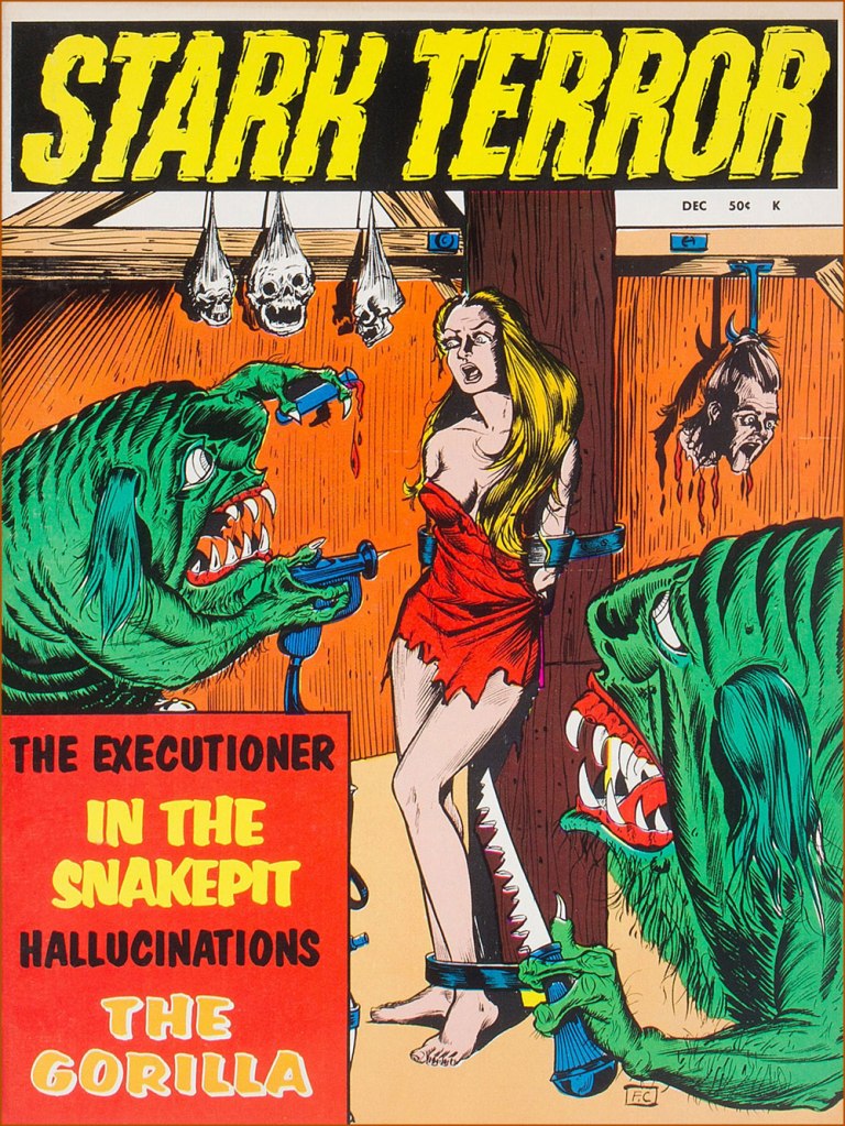 This is Stark Terror no. 1 (Dec. 1970, Stanley); cover art by Frank Carin (né Carino).This is Stark Terror no. 2 (Feb. 1971, Stanley); cover art by Carin.This is Stark Terror no. 3 (Apr. 1971, Stanley); cover art by Mexican illustrator Héctor Castellón .This is Stark Terror no. 4 (June 1971, Stanley); cover art by Carin.This is Stark Terror no. 5 (Aug. 1971, Stanley); cover art by Carin. Just in time for cancellation, a new logo, possibly by Ben Oda.As a bonus, here’s the surviving original art to the publisher’s Ghoul Tales no. 1 (Nov. 1970, Morse); artwork, again, by Mr. Frank Carin.