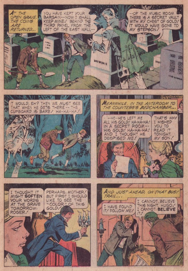 Here we have Hamilton, Ontario’s Win Mortimer (1919-1998) at his most stylish. A competent craftsman, he drew a lot of Superman and Batman for DC in the Golden Age, and may be most remembered by readers of a certain generation for his work on Marvel and The Children’s Television Workshop‘s Spidey Super Stories (57 issues, 1974- 1982). As for me, I was always fondest of his work for Gold Key’s mystery titles, where he seemed to be having more fun.