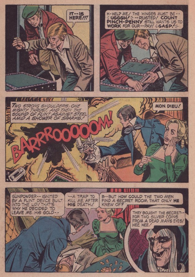 A scroogey teaming of WOT? favourites Steve Skeates and Alfredo Alcala, this turned up in Weird War Tales no. 35 (March 1975, DC). I’ll bet they had trouble deciding whether to run it in Plop! or WWT.