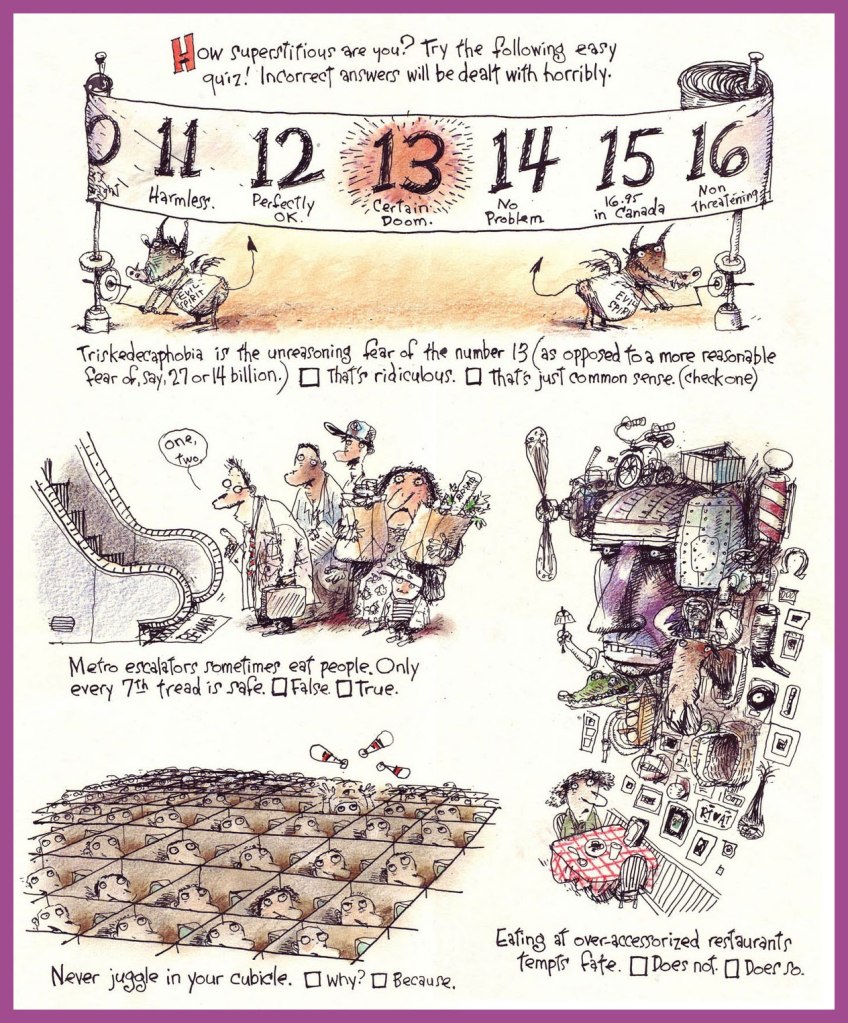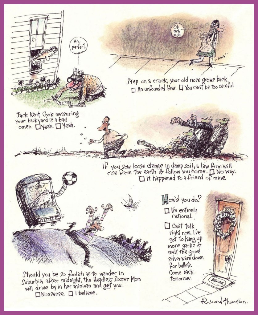 Here, then, is a trio of seasonally-and-thematically pertinent excerpts from his Richard’s Poor Almanac, a feature that made its august début in The Washington Post in 1997. Mr. Thompson is somewhat better known for his (other) masterpiece, the beyond-brilliant suburban family comic strip, Cul de Sac (2004-2012).