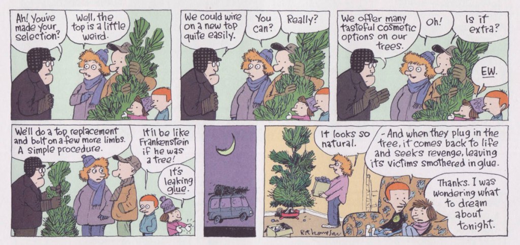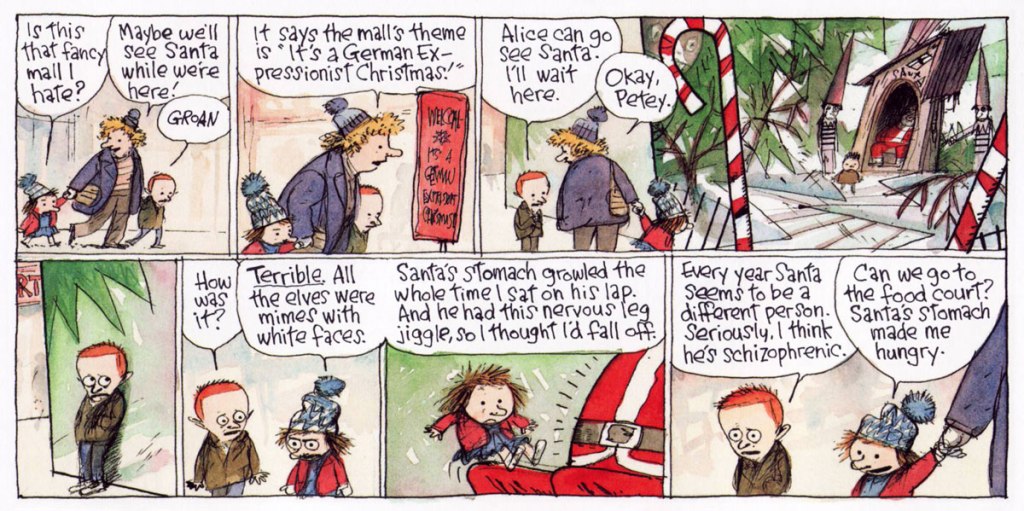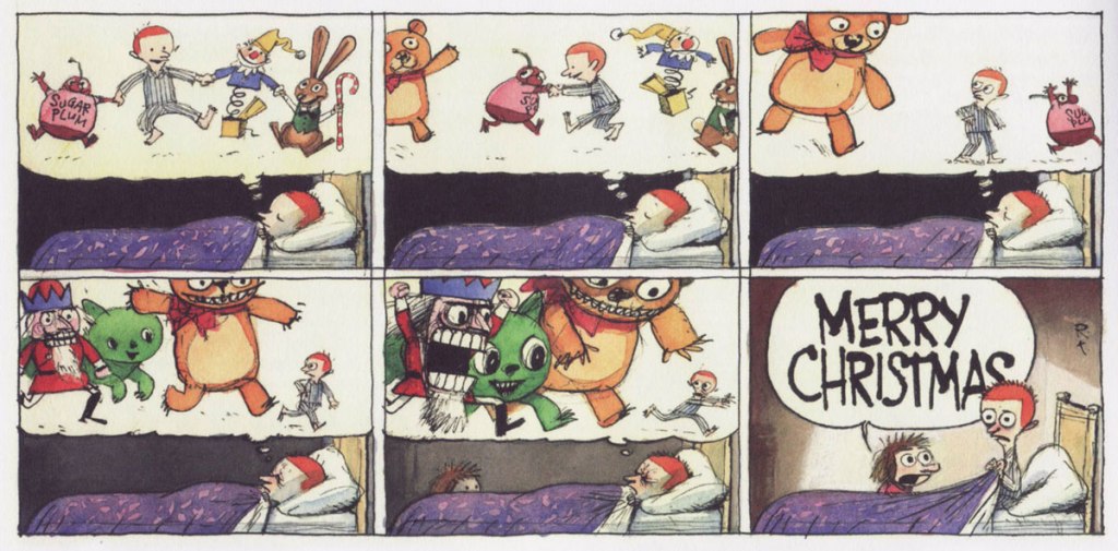 RT: « The creepier side of Christmas. A German Expressionist Christmas has been done by someone, somewhere, I’m sure. » December 11, 2005.RT: « Taking down Christmas is always so hard. I like the timing here. » January 1st, 2006.RT: « Petey dreams of Christmas with music by Tchaikovsky. » December 24, 2006.RT: « Santa Claus commands a lot of fear and awe in children.I could never get a coherent sentence out when sitting on his lap when I was a kid, and I doubt I could today. Thank God I don’t believe in him anymore! » December 23, 2007.RT: « The first appearance of Dill’s mysterious, malignant, poignant, and possibly educational toy. I just wanted something that’d be easy and repetitive to draw, because I was behind. » December 30, 2007.RT: « What I like the most is the tree seller’s resemblance to a mortician. » December 21, 2008.December 28, 2008.RT: « Drawn from life. Nothing more need be said. » December 19, 2010.RT: « Petey’s faith in his commentaries’ scathing qualities is misplaced. » December 4, 2011.RT: « Doing this was a joy. The hard part was doing it in pantomime. » December 11, 2011.