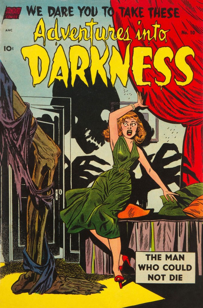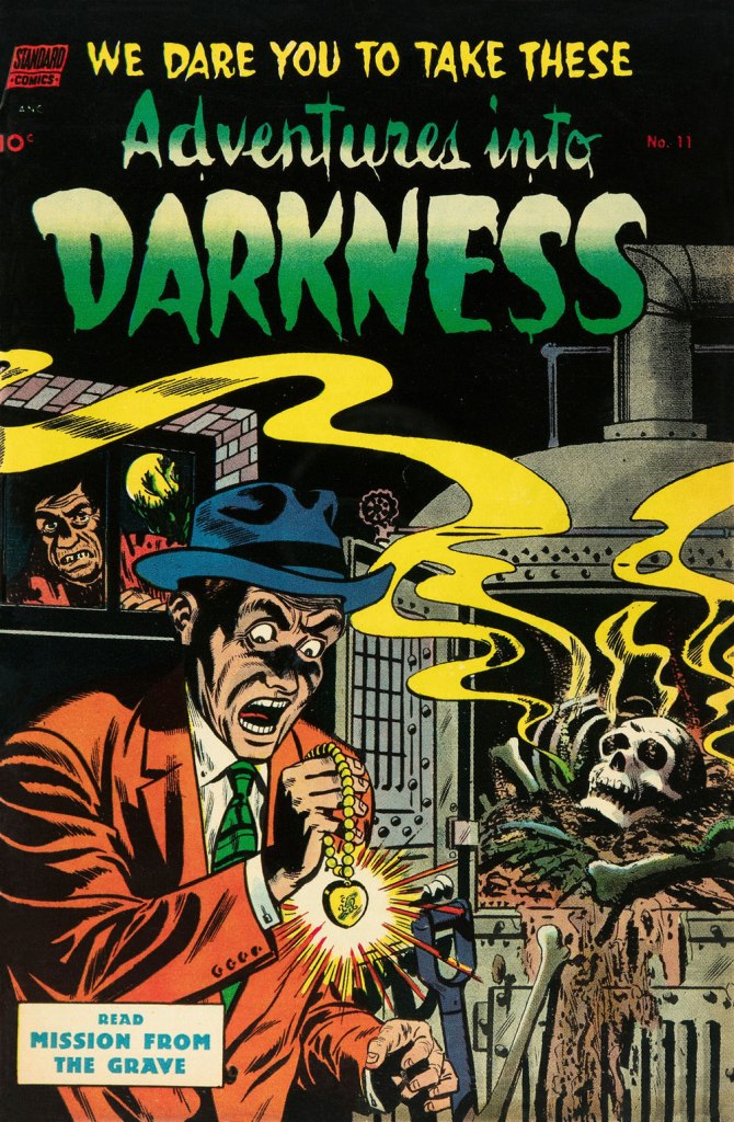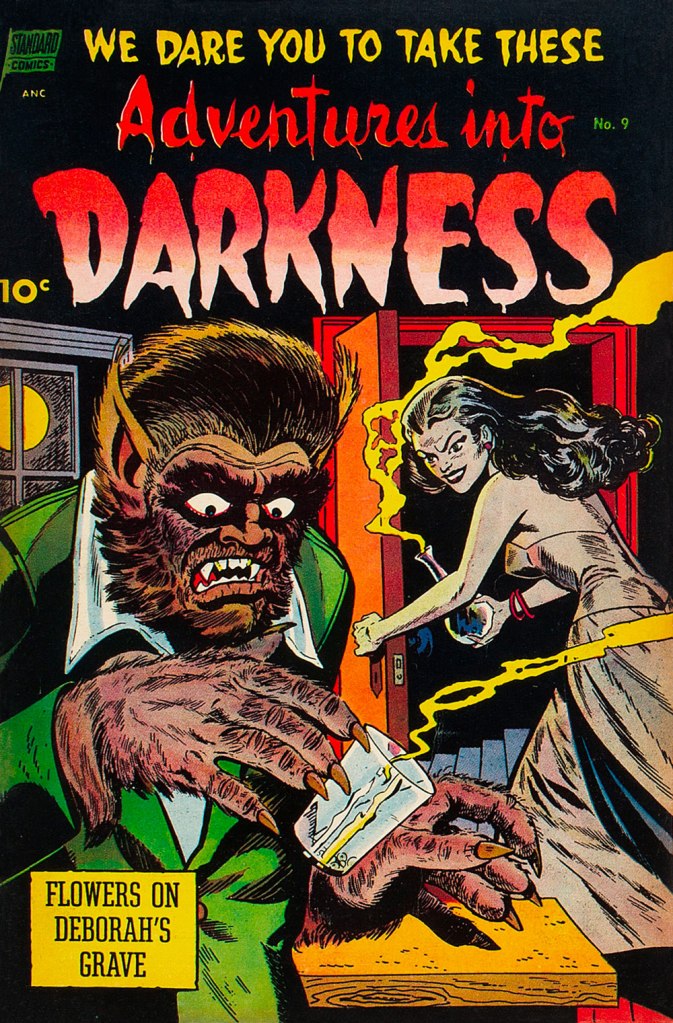 This is Adventures Into Darkness no. 5 — the first issue — don’t ask — (Aug. 1952, Standard). Cover by George Roussos (1915-2000).This low-key entry is Adventures Into Darkness no. 6 (Oct. 1952, Standard). Cover by George Roussos. Though unspectacular, this theme would be taken up and imitated (with variations) a bunch of times, which goes to demonstrate some folk’s morbid fear of marriage.This is Adventures Into Darkness no. 7 (Dec. 1952, Standard). Cover by the remarkably driven Jack Katz (b. 1927)… a most interesting man.This is Adventures Into Darkness no. 8 (Feb. 1953, Standard). Cover by future Charlton Comics pillar Rocco “Rocke” Mastroserio, already showing his tremendous potential as a cover creator. One of my all-time favourite bloggers (et cetera!) Jason Willis, loved this cover so much that he used it to create a bonafide animated commercial for the issue! Bless you, Jason!This is Adventures Into Darkness no. 9 (Apr. 1953, Standard). Cover artist unknown… and what’s going on here? Did the femme fatale turn her unsuspecting victim into a werewolf, or did she doom him with a deadly dose of acid or some other poison?This is Adventures Into Darkness no. 10 (June 1953, Standard). Cover by Ross Andru… possibly my very favourite cover of his — lord knows he dragged his reputation through forty miles of bad road with his dire late 1970s work at DC.This is Adventures Into Darkness no. 11 (Sept. 1953, Standard). And we’re back to Mr. Roussos, who provides more of a crime comic cover this time around. Still grisly, though!This is Adventures Into Darkness no. 12 (Dec. 1953, Standard). Cover by Mike Sekowsky… those cute little caps the mine demons are wearing are a bit of a Sekowsky trademark.
