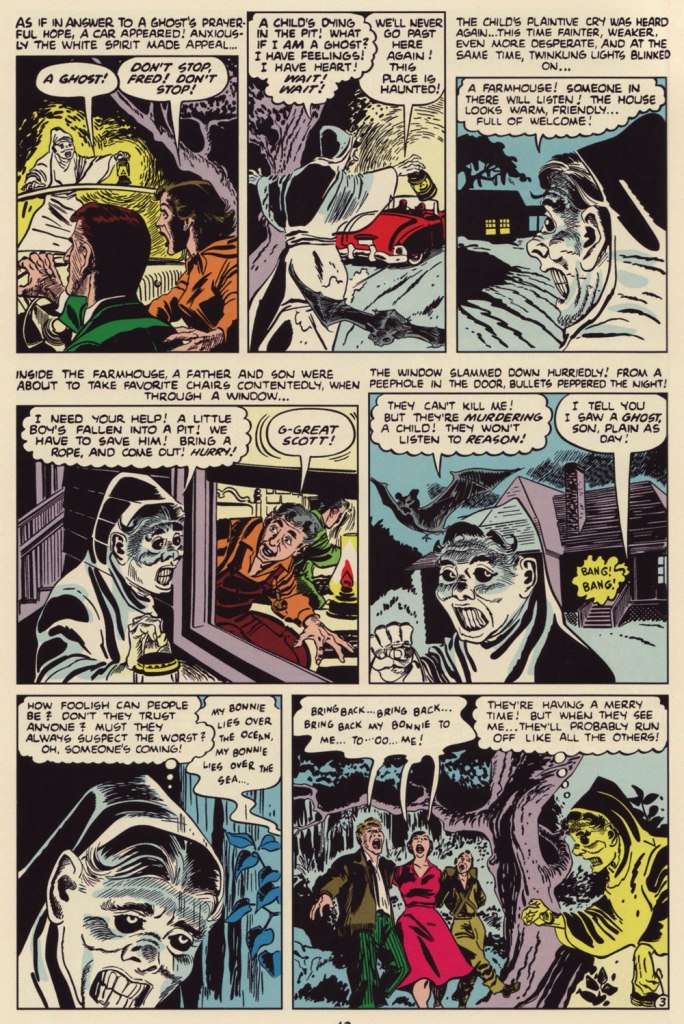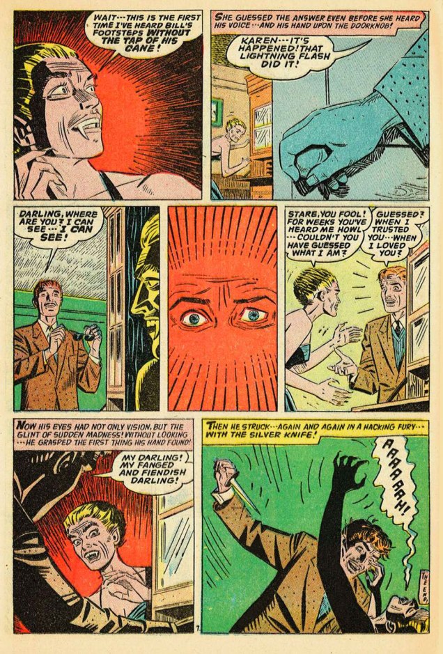I’ve expressed many a time my ambivalent affection for Golden Age Atlas horror comics: in short, despite their slapdash, often incoherent writing, they had a solid stable of artists (which makes the thin writing all the more disappointing); but most of all, they generally had eye-catching covers, splendidly coloured (easy a task to underestimate!) and blessed with a light touch absent on the insides.