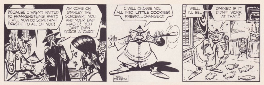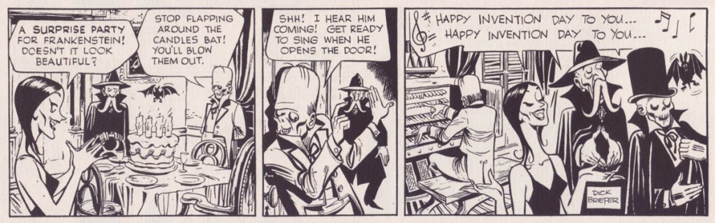 In a 1979 letter to Al Dellinges, Briefer recalled « Frankenstein, the comic version, was always a joy, and I have some superb samples of a projected daily strip that had been turned down by syndicates in the past. At this stage in my life, even though ‘horror’ is ‘in’, I’m too lazy to start sending it out again. »